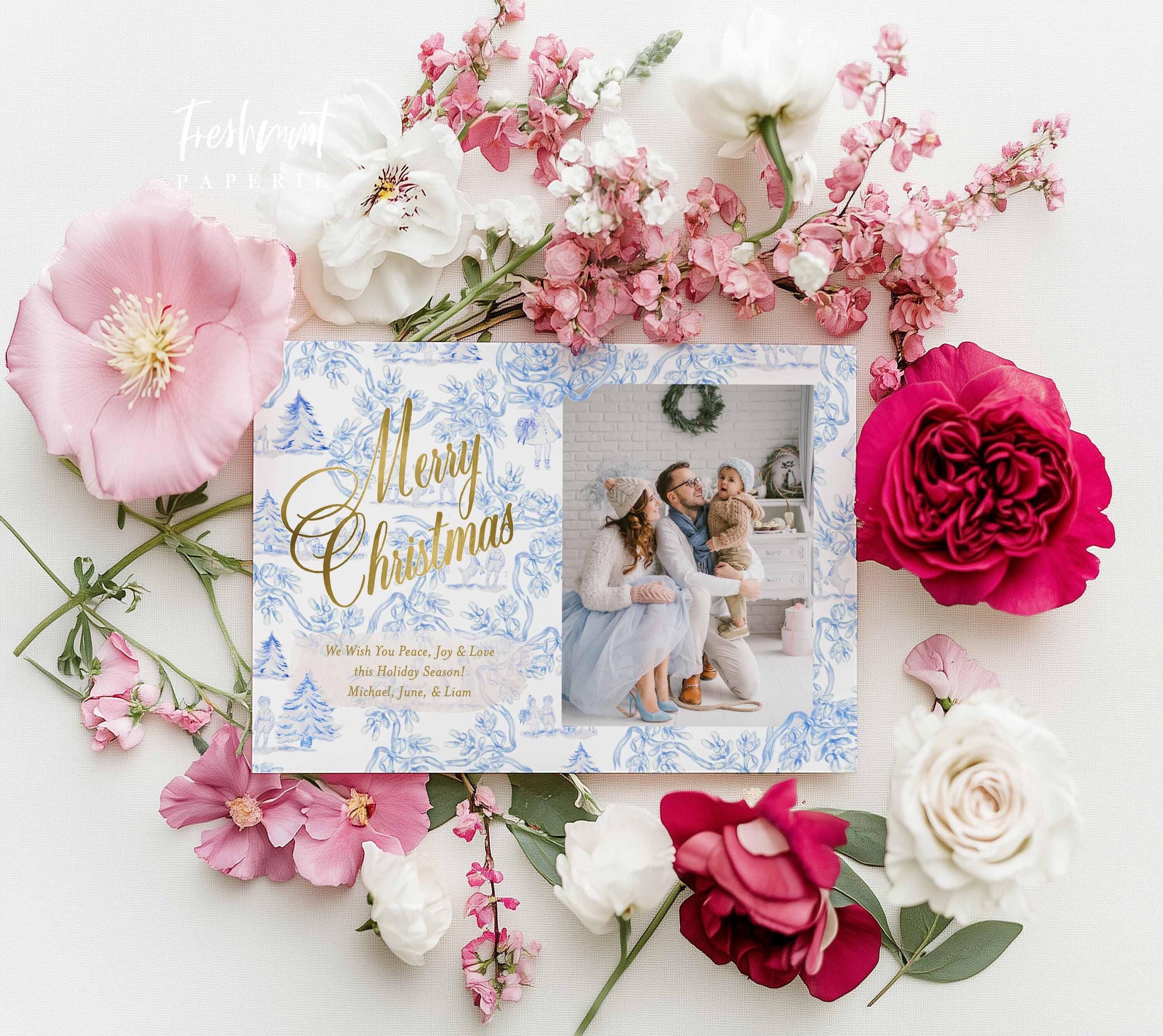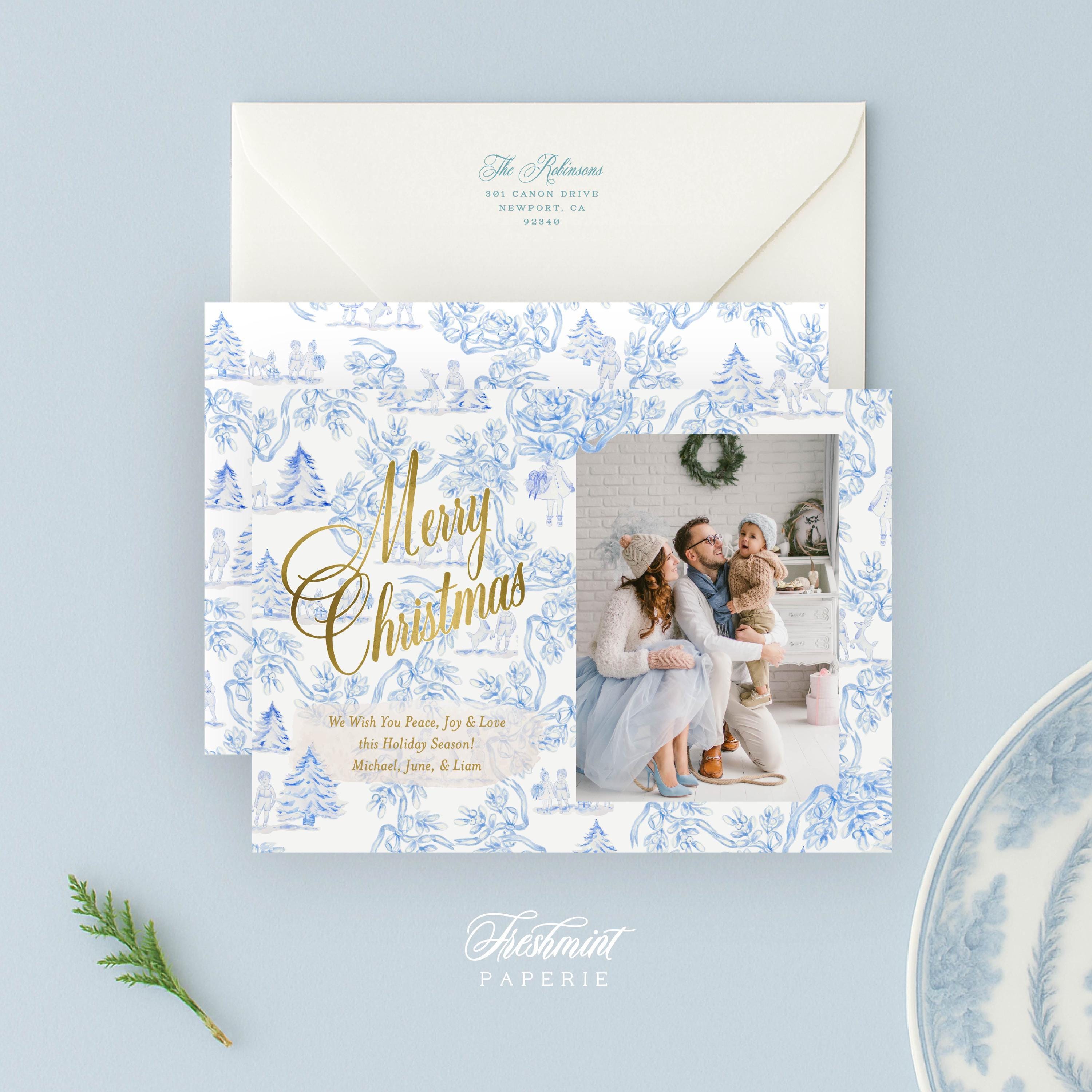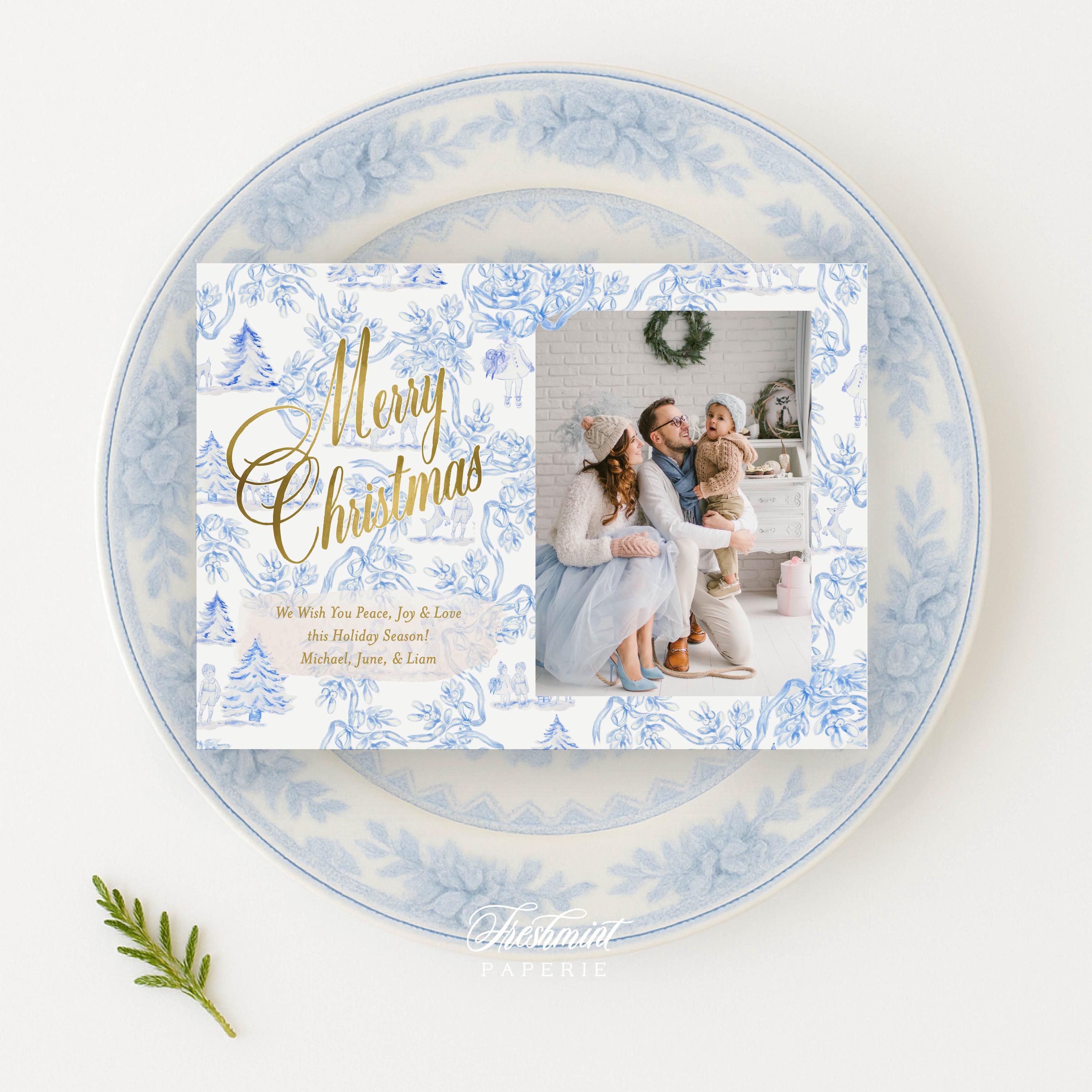 Chinoiserie Photo Christmas Cards: Blue Ribbon Holiday Design