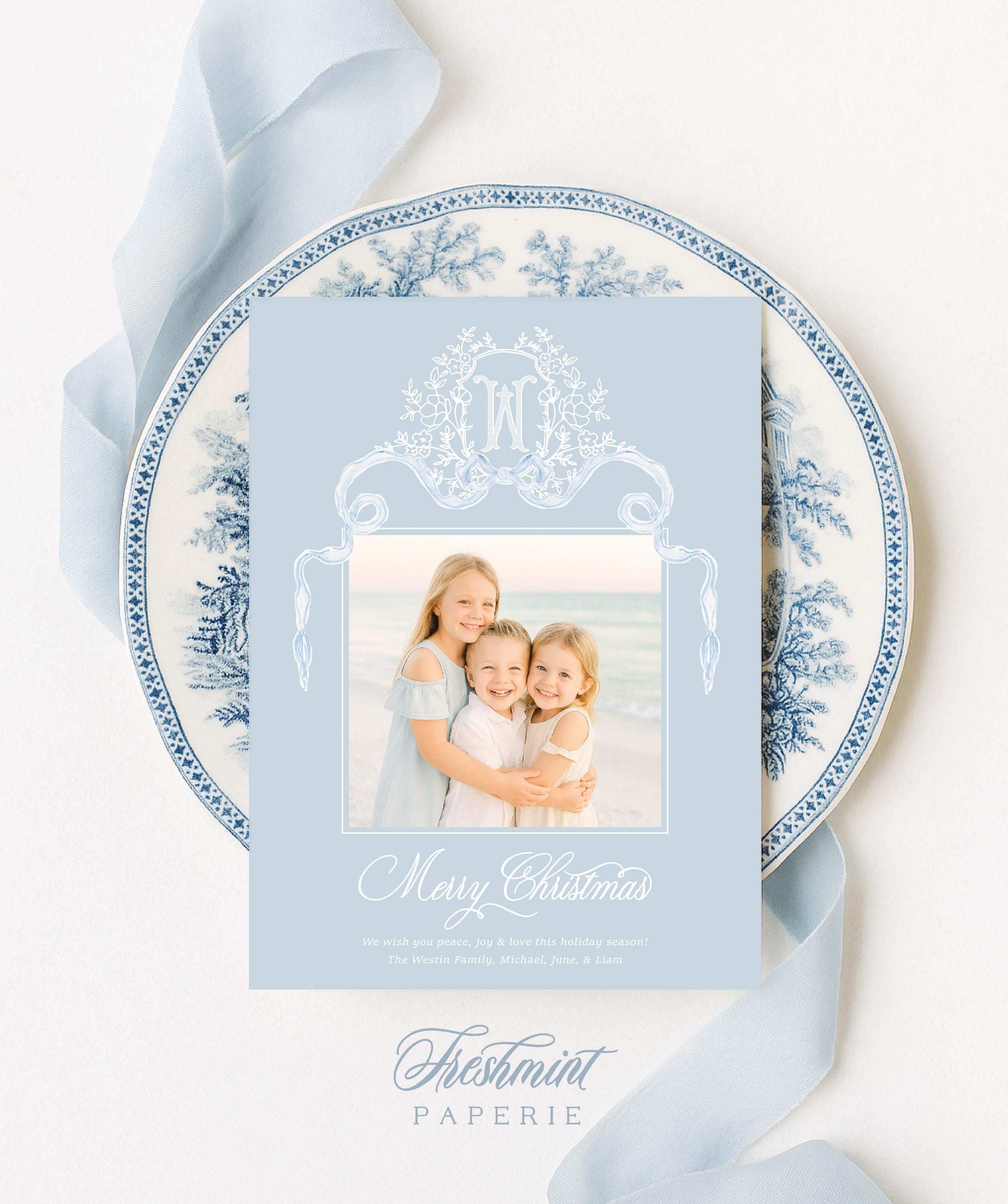 Blue Classic Monogram Photo Holiday Card: Custom Christmas Card