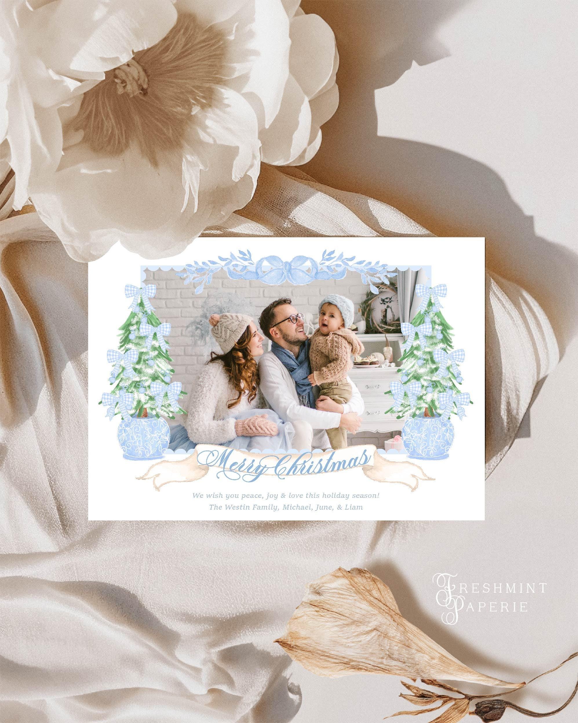 Blue Floral Photo Christmas Cards, Gingham Wreath
