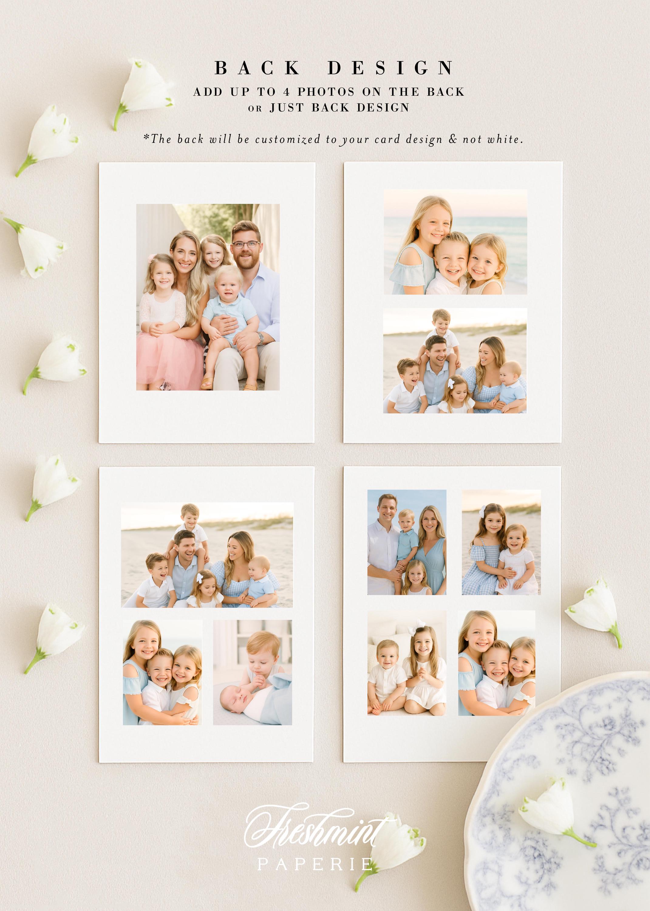 Our cards can have 1 image on the front & up to 4 on the back, if you don't want images on the back, they all come with matching back design.