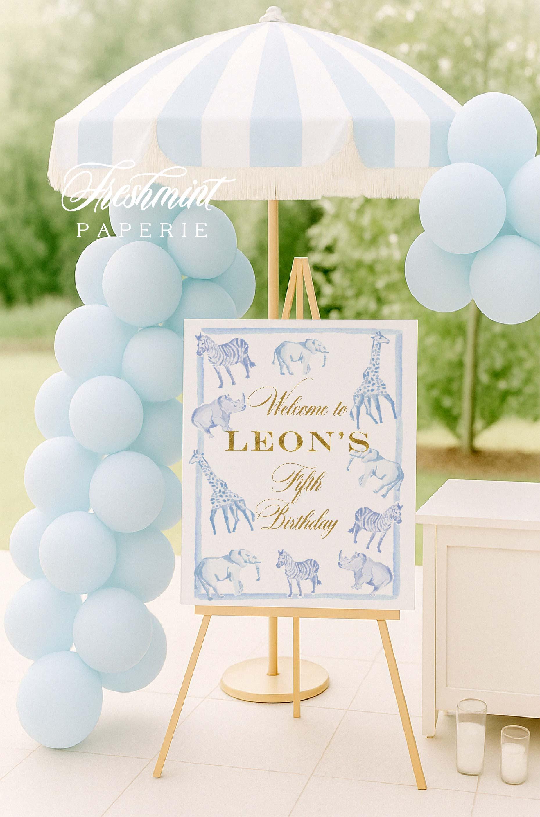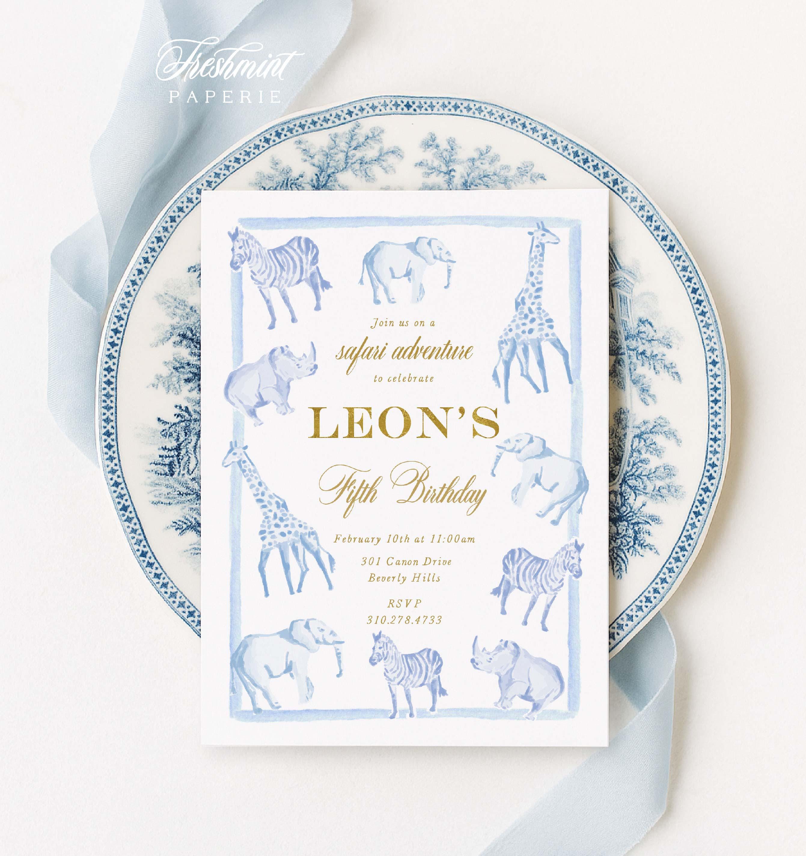 Watercolor Safari Birthday Invitation, Wild One Party, Giraffe, Elephant, Zebra, Rhino, Blue, Gingham