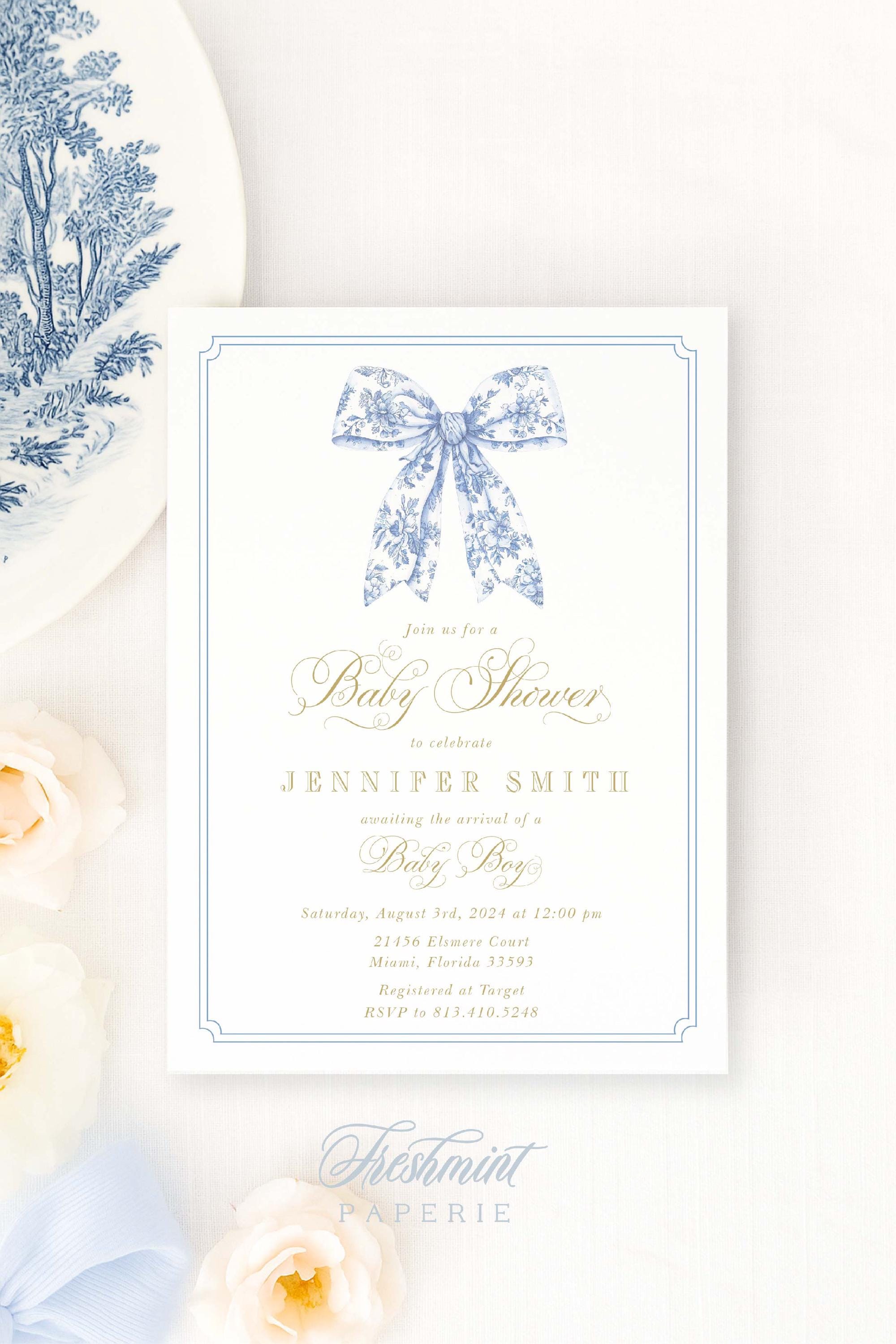Toile Baby Shower Invitation, Watercolor Blue Bow, Chinoiserie