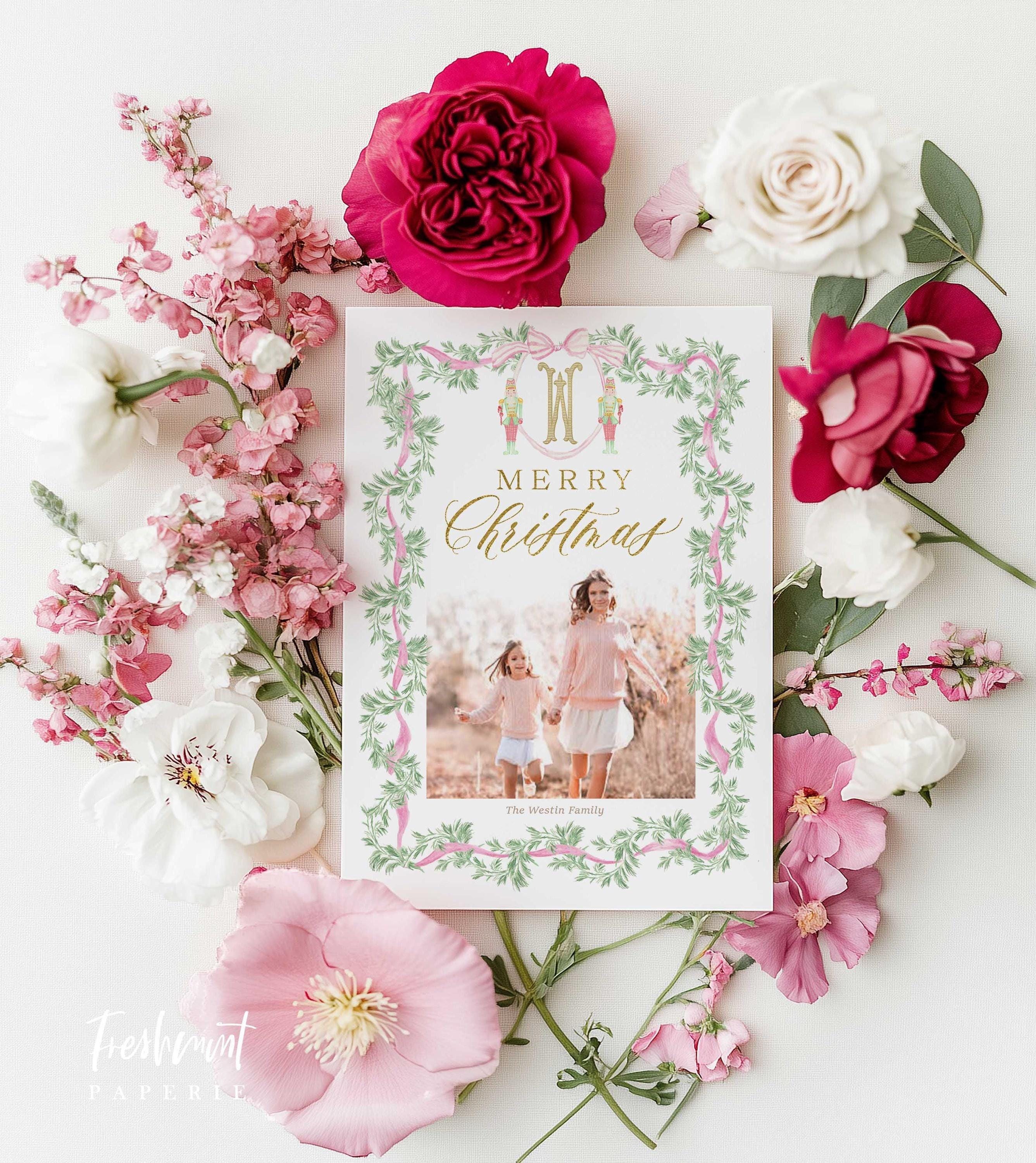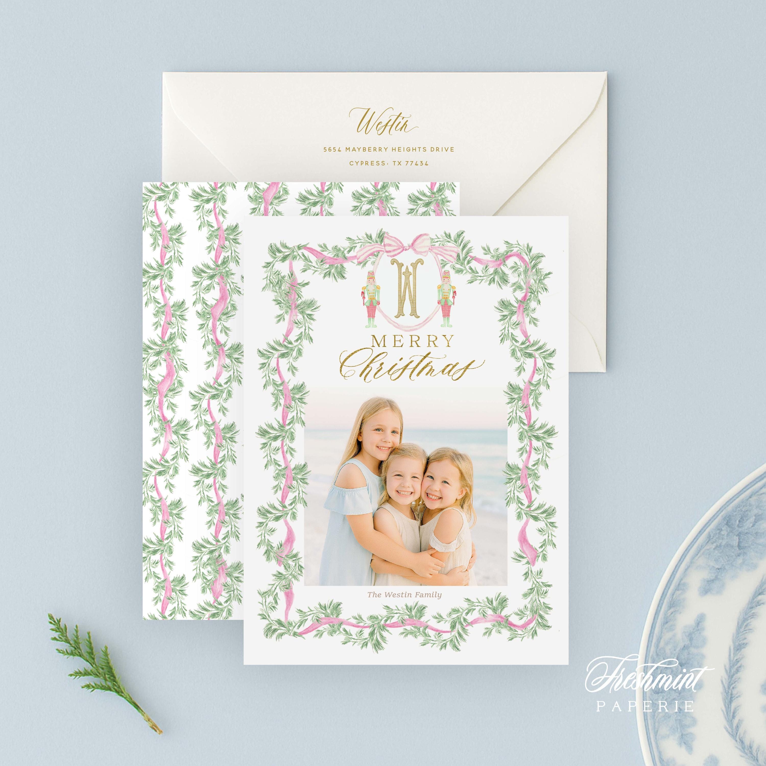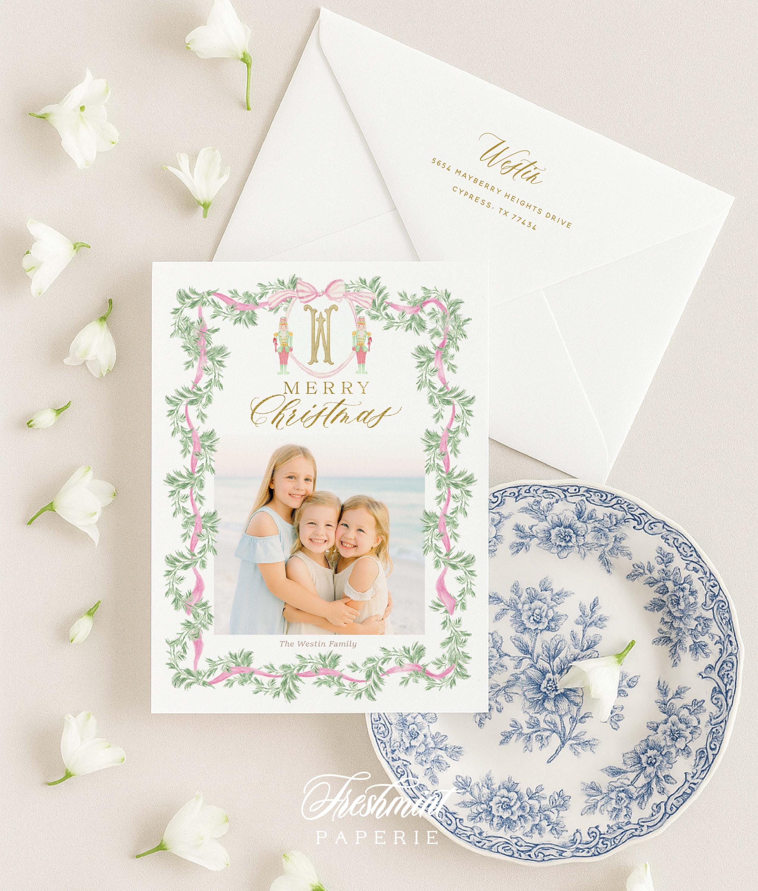 Pink Nutcracker Photo Christmas Cards, Monogram Wreath