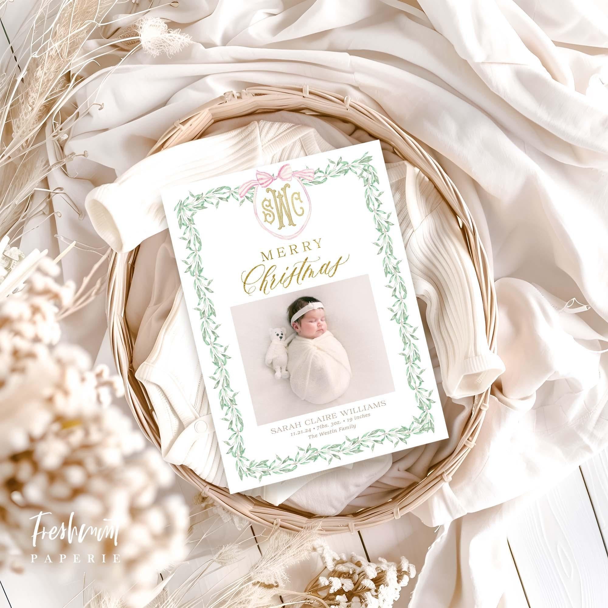 Photo Christmas Card, Pink Crest Monogram, Newborn Holiday Card