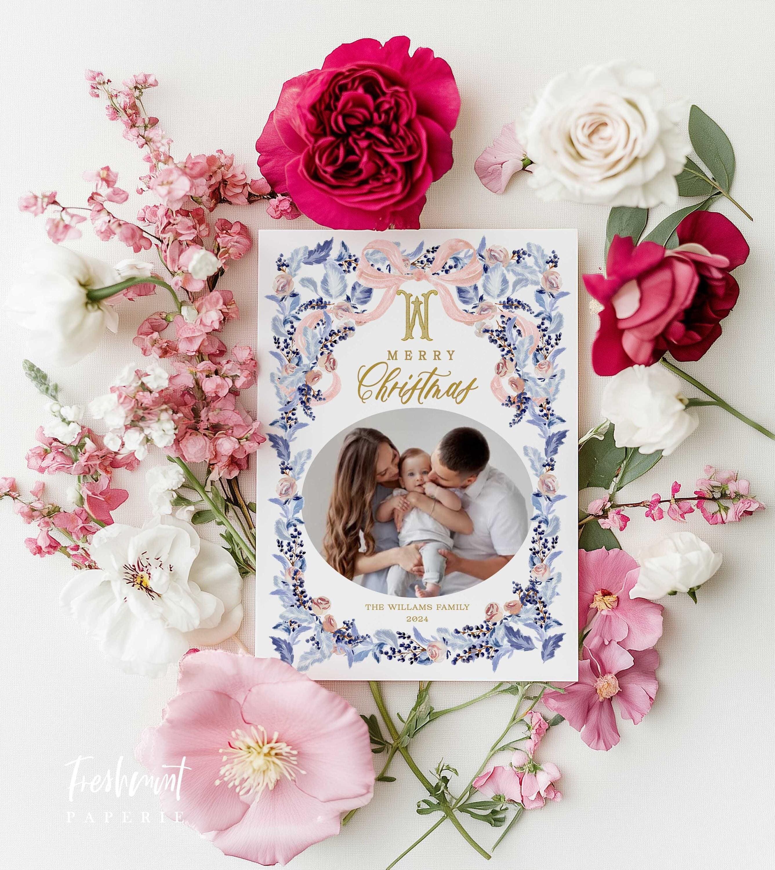 Blue Floral Wreath Photo Christmas Card, Monogram Holiday Cards