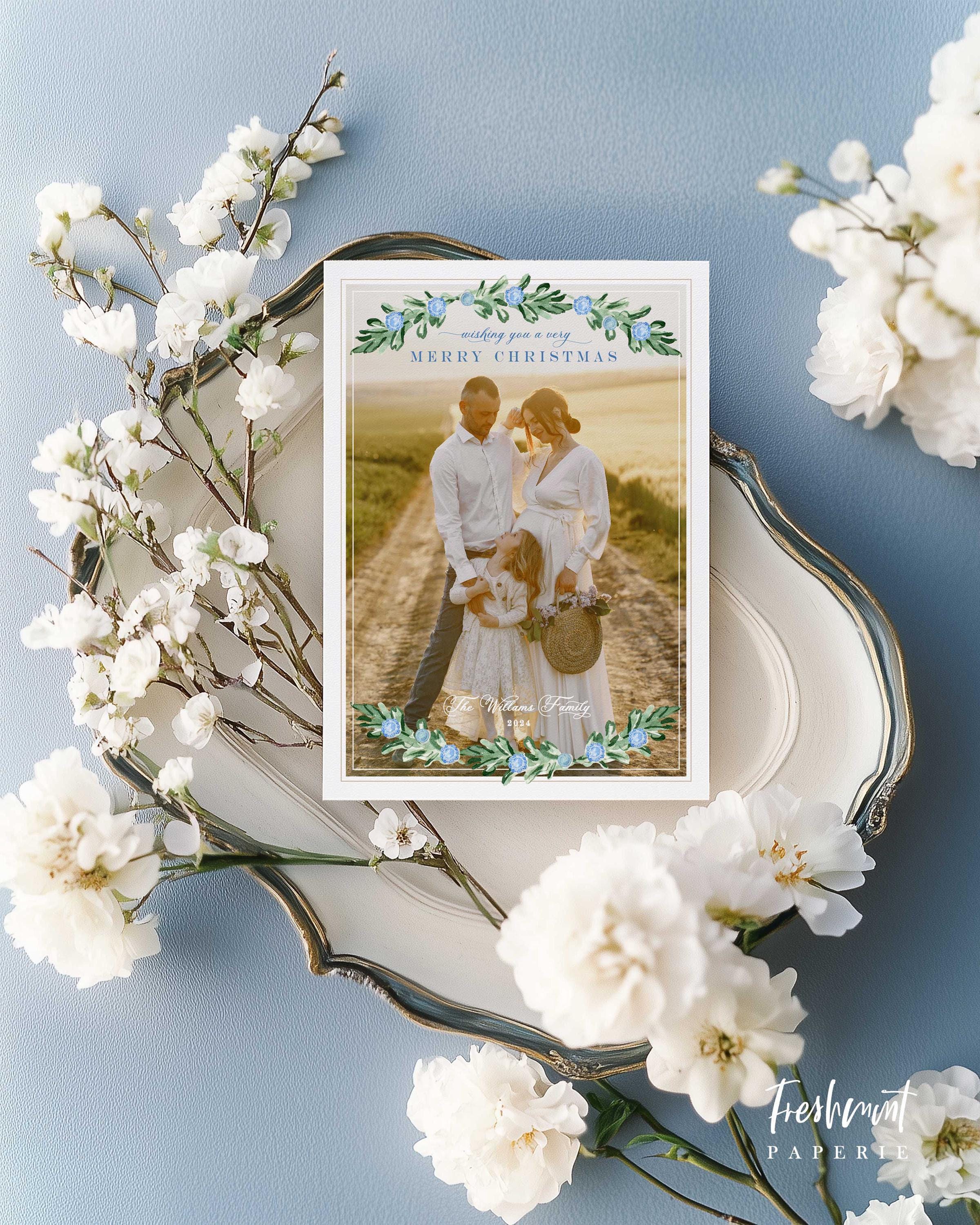 Blue Floral Photo Holiday Cards: Chinoiserie Christmas Wreath