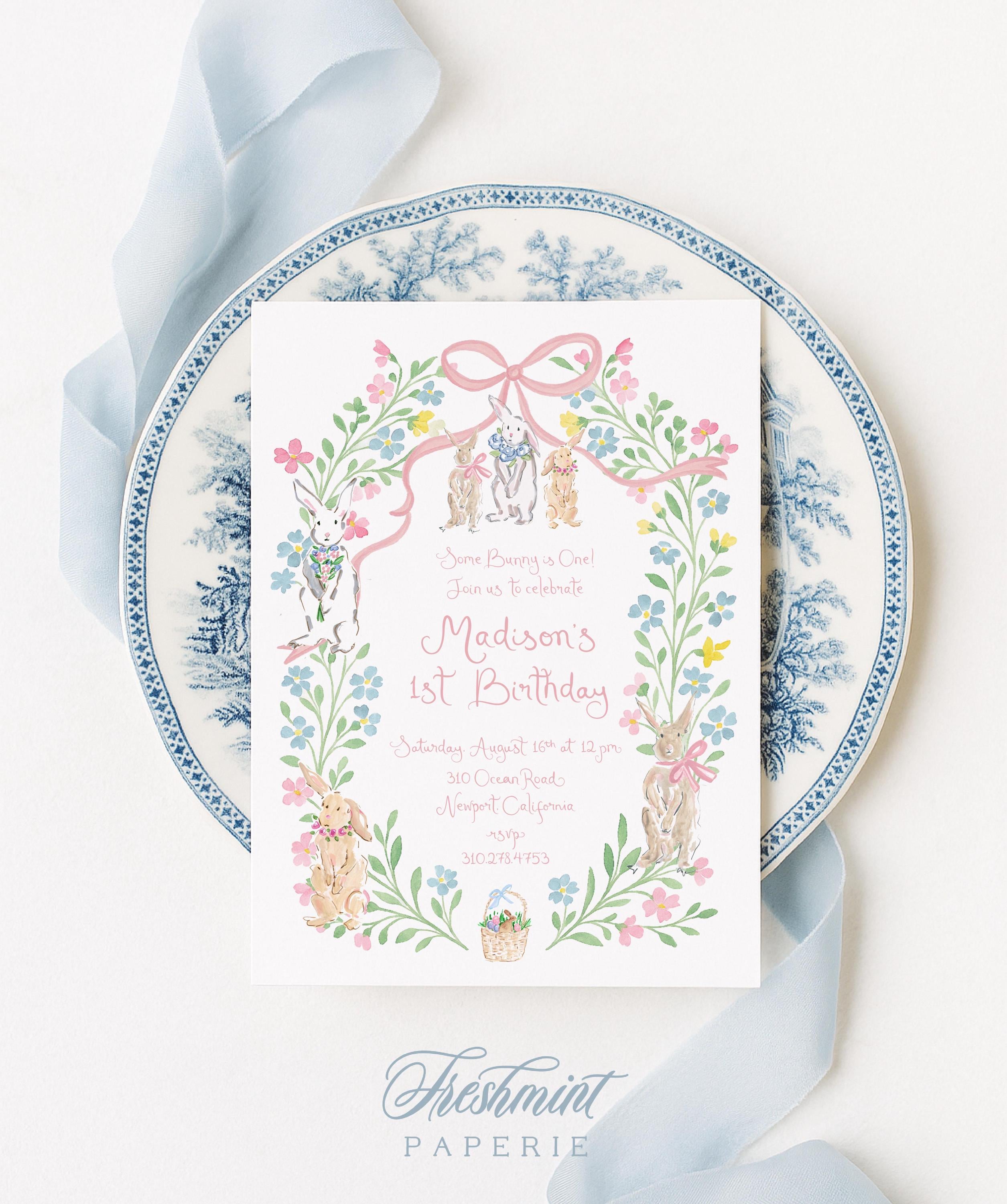 Pink Bunny Birthday Invitation: Watercolor Floral, Gingham, Grandmillennial, Pink Bow, Easter