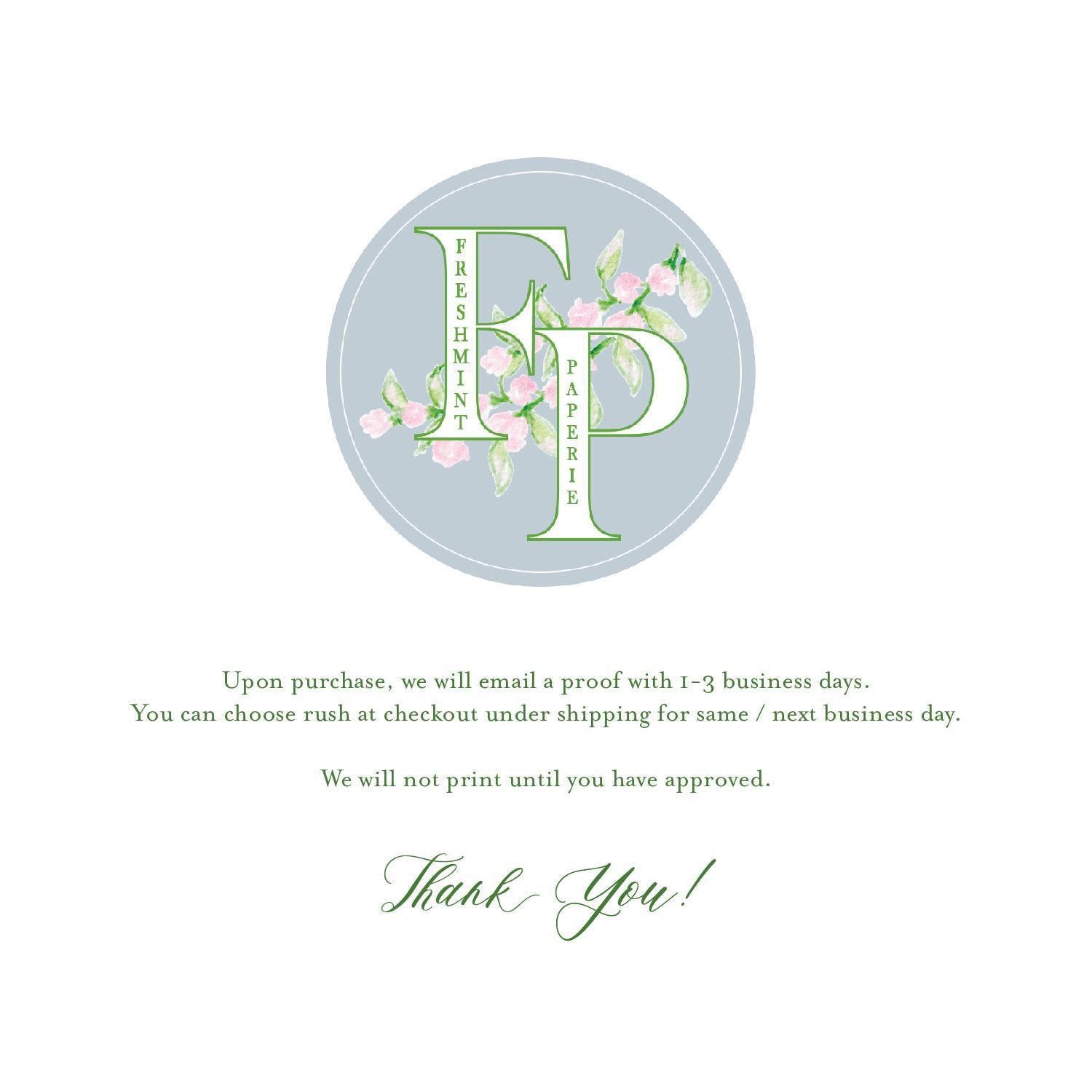 Proofs are emailed within 1-3 business days. Rush (next day) available at checkout under shipping options.