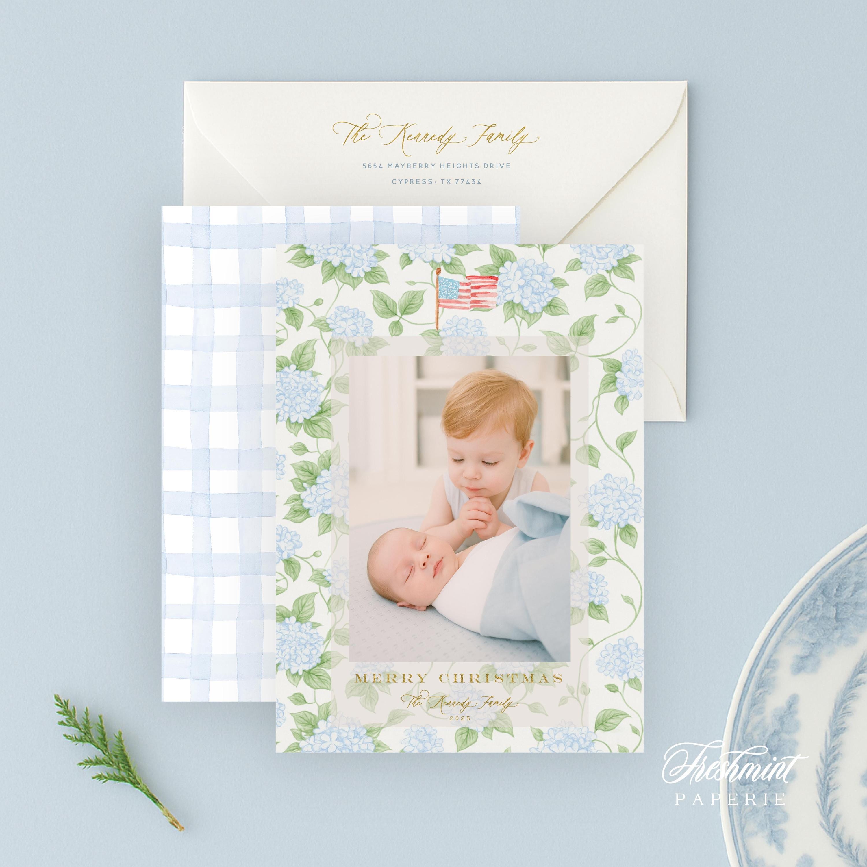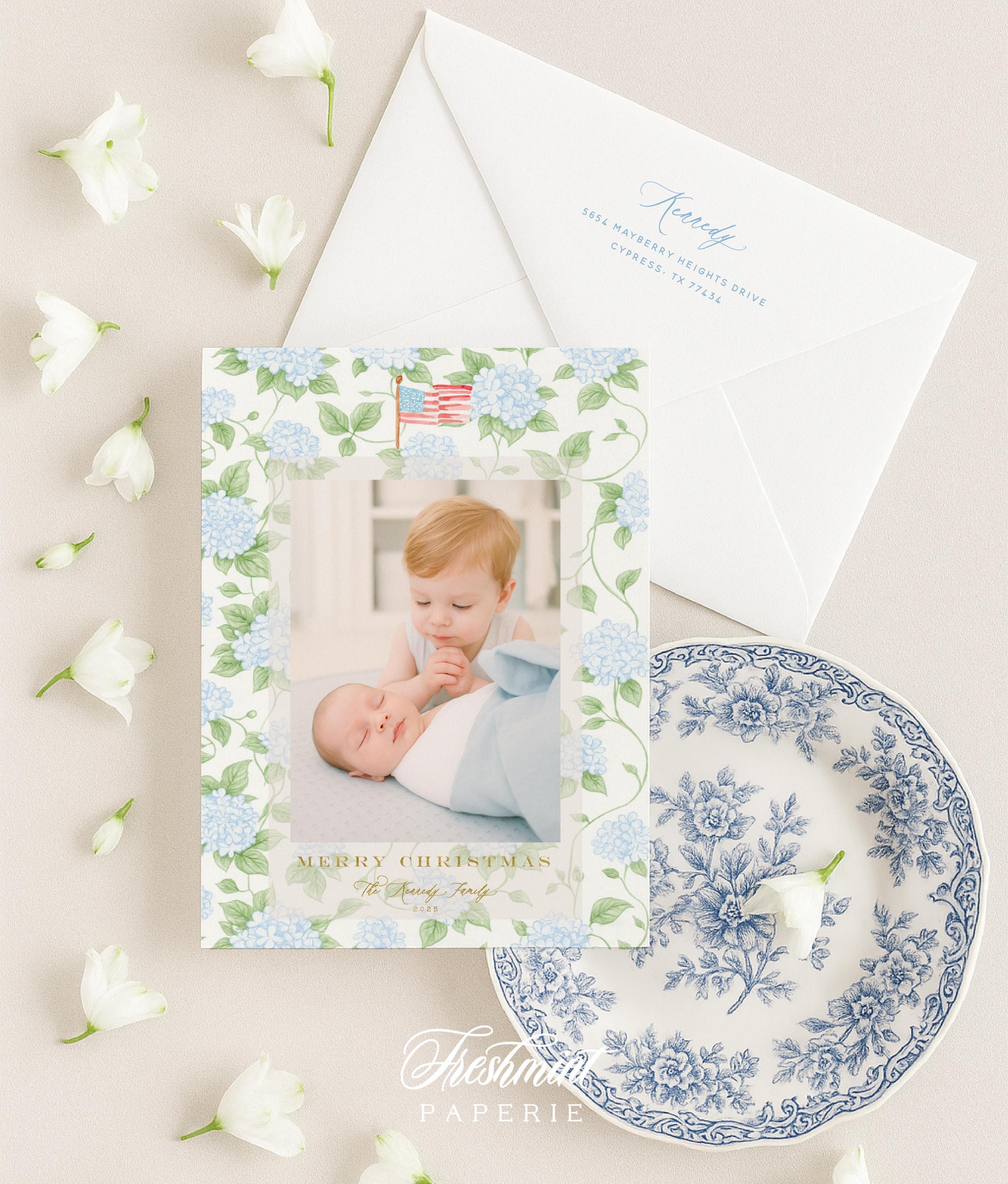 Watercolor Hydrangea Holiday Photo Cards: Grandmillennial Christmas, American Flag