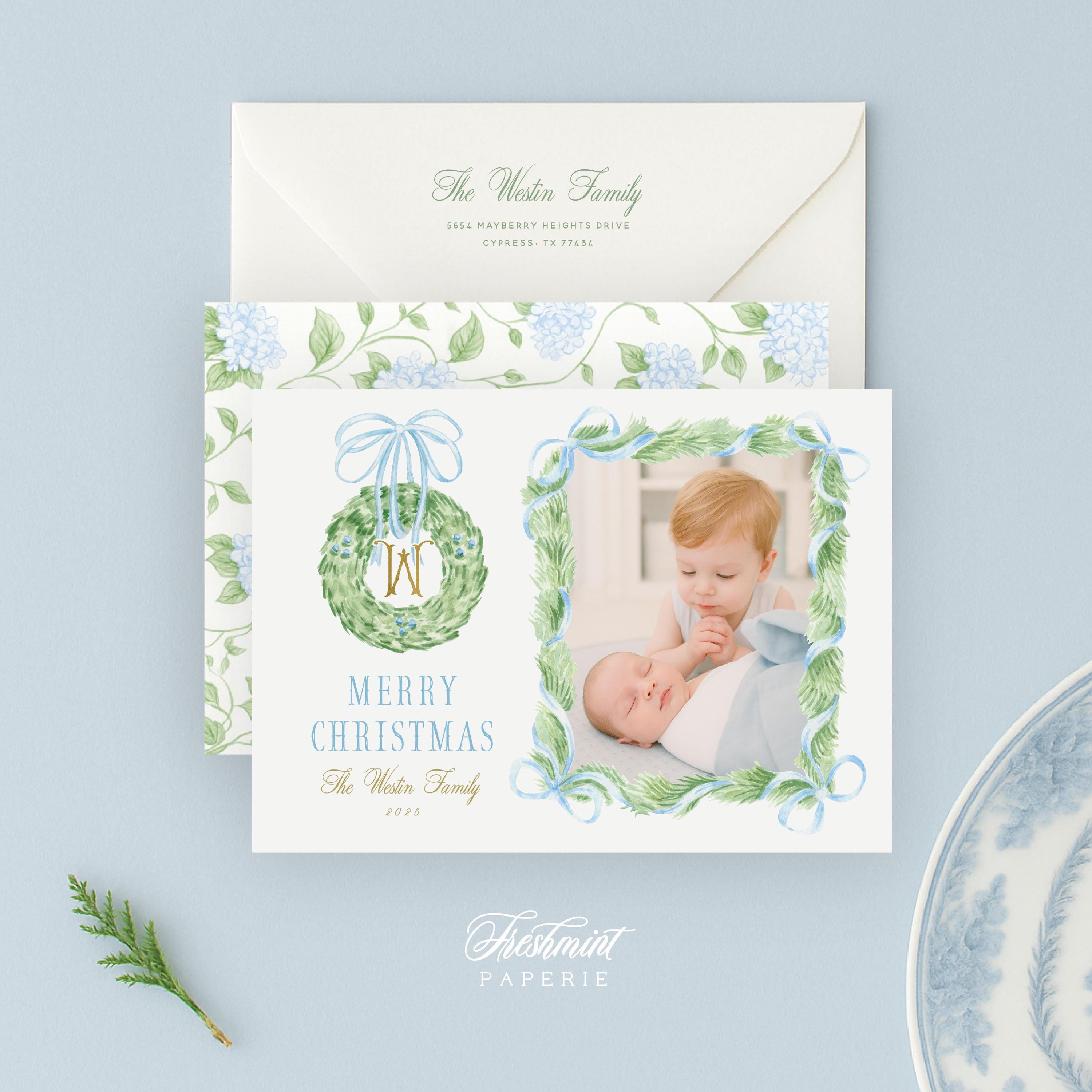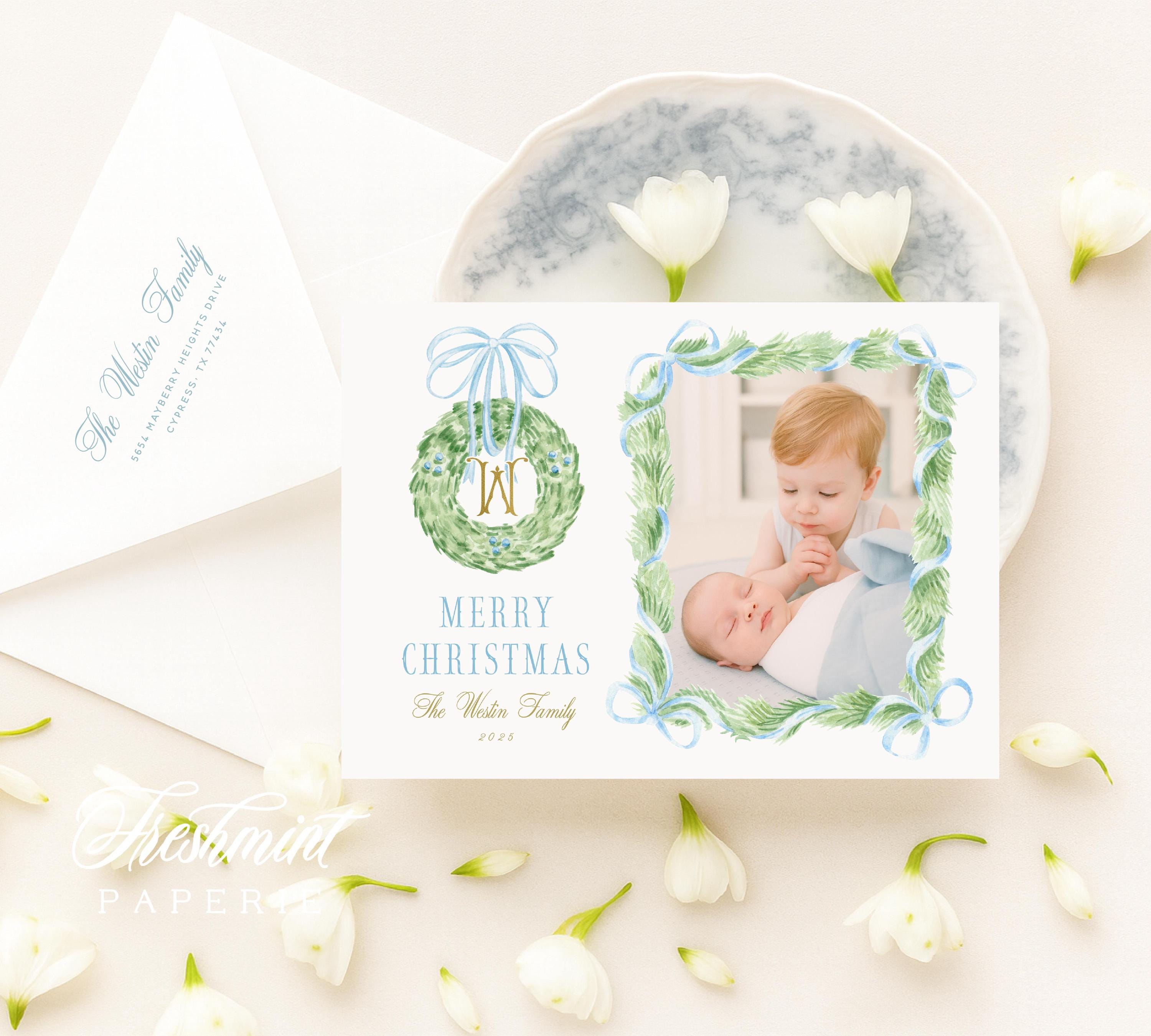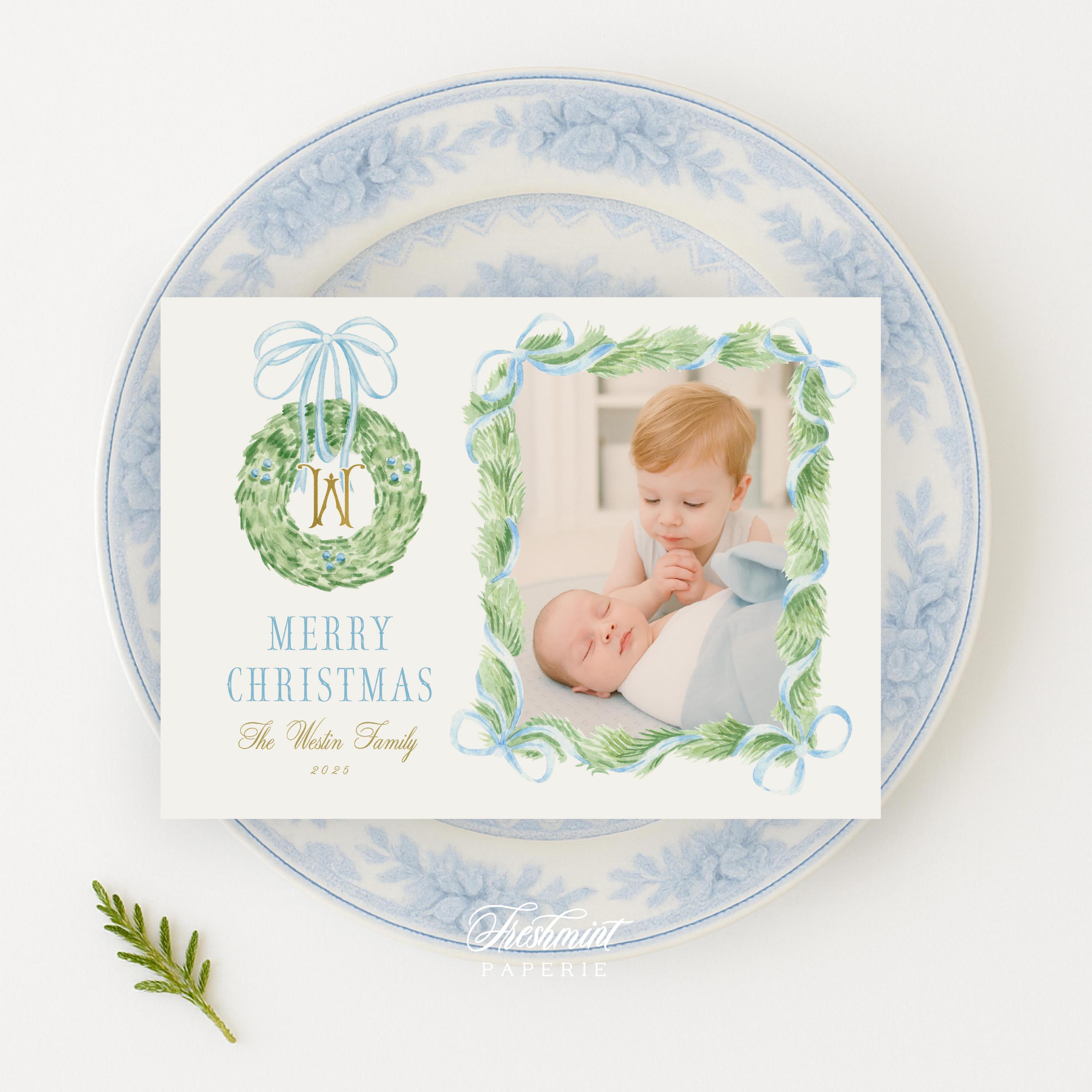 Blue Floral Photo Holiday Cards: Monogram Wreath Design