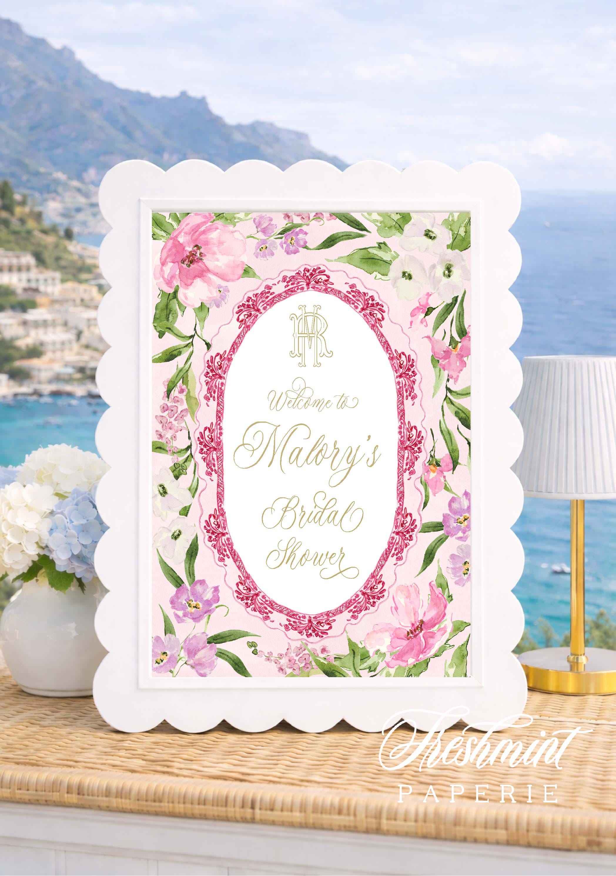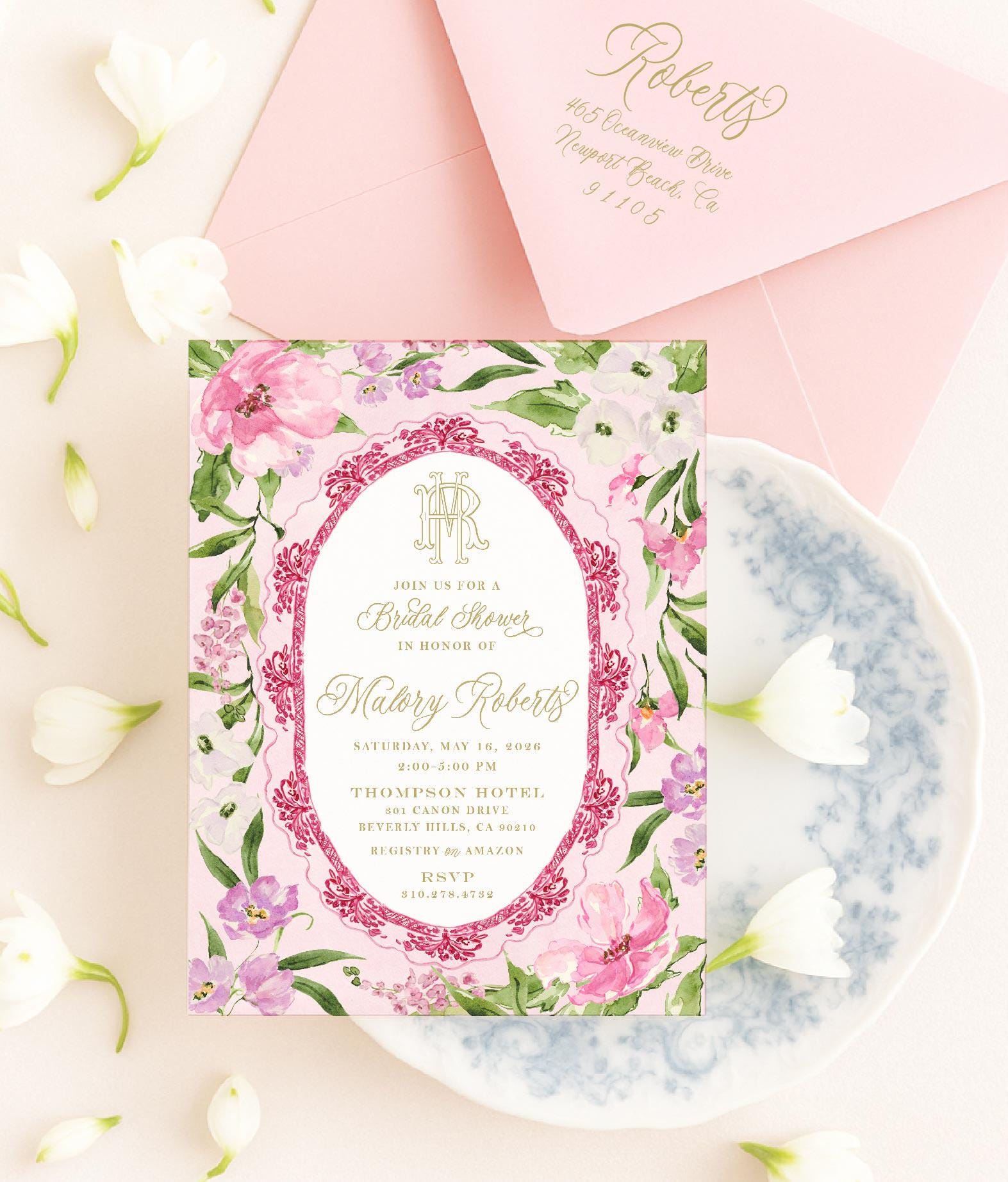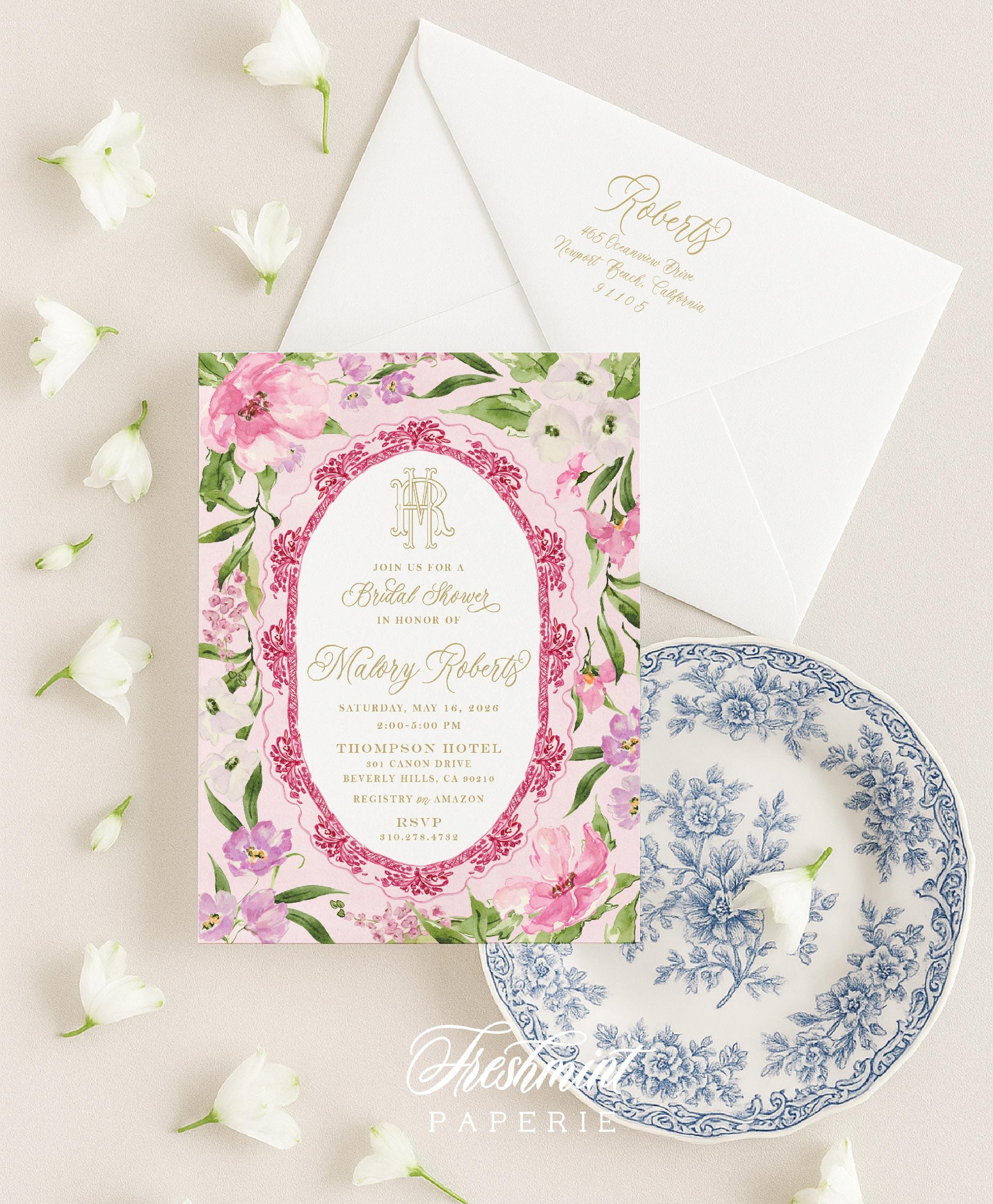 Floral Crest Bridal Shower Invitation: Monogram, Pink Toile