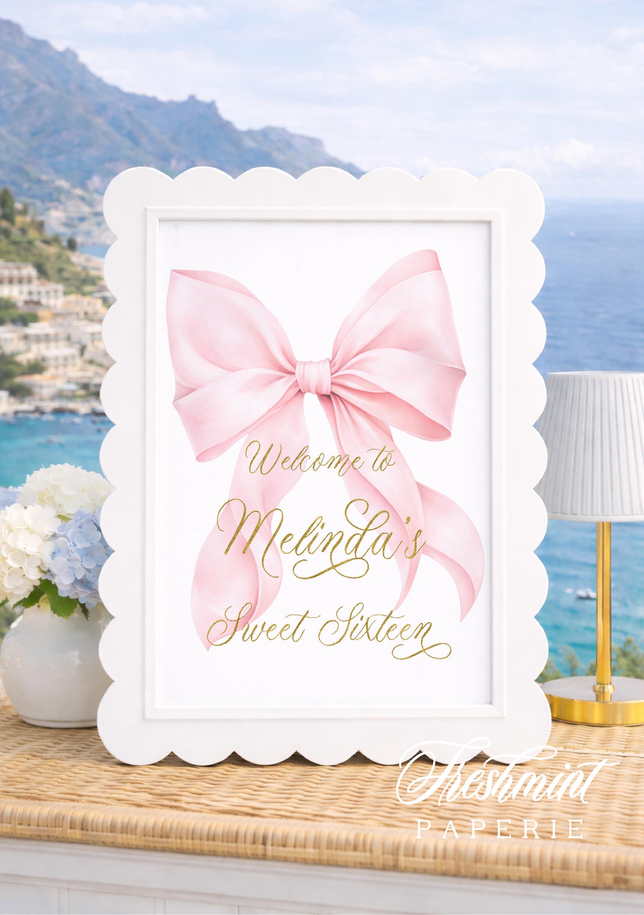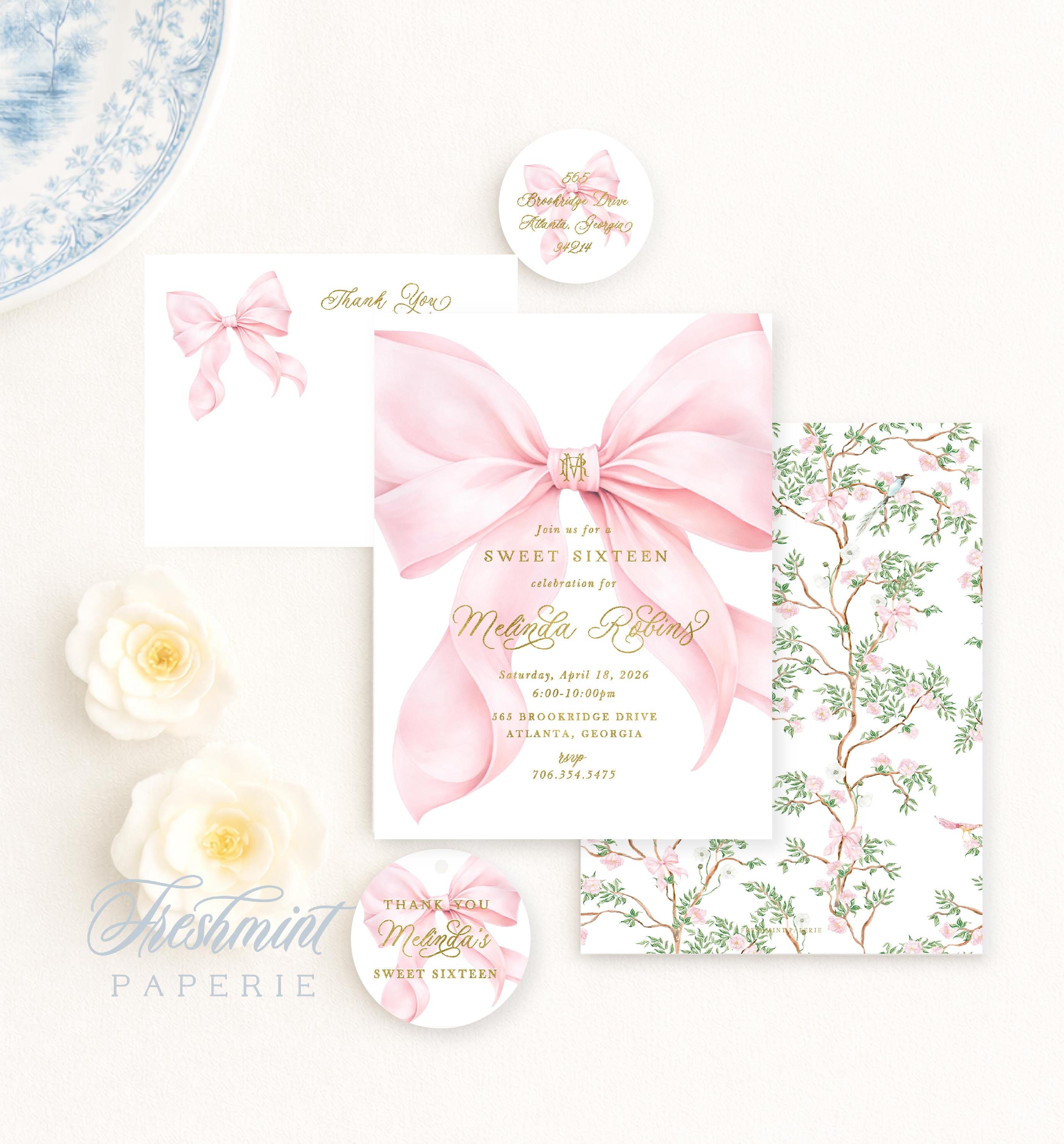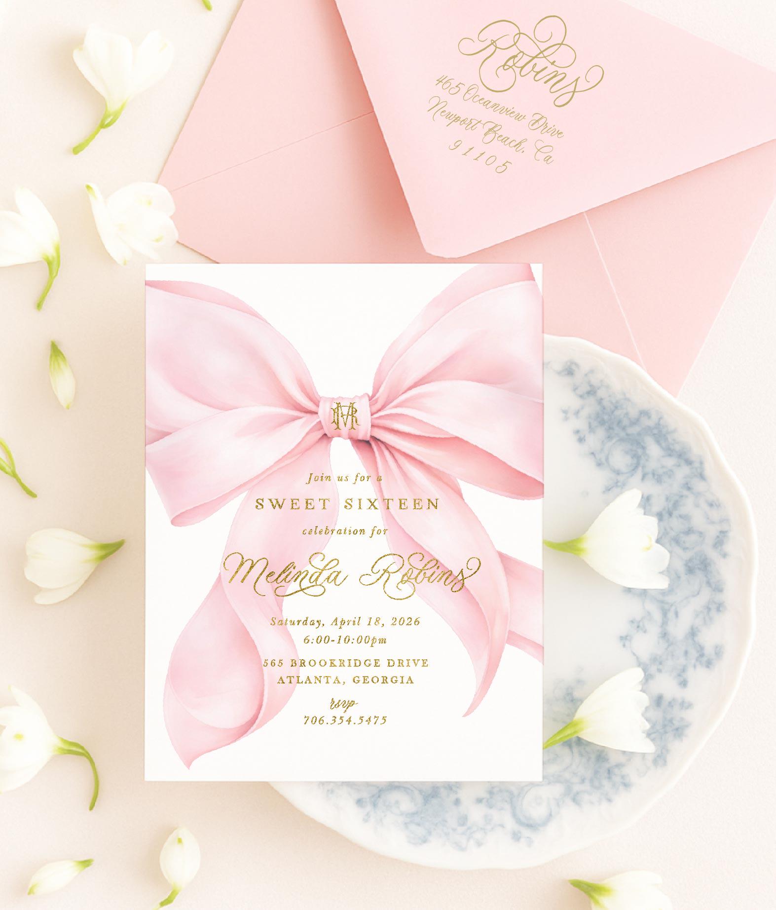 Sweet Sixteen Invitation, Pink Bow, Monogram, Watercolor, Cherry Blossom, 16