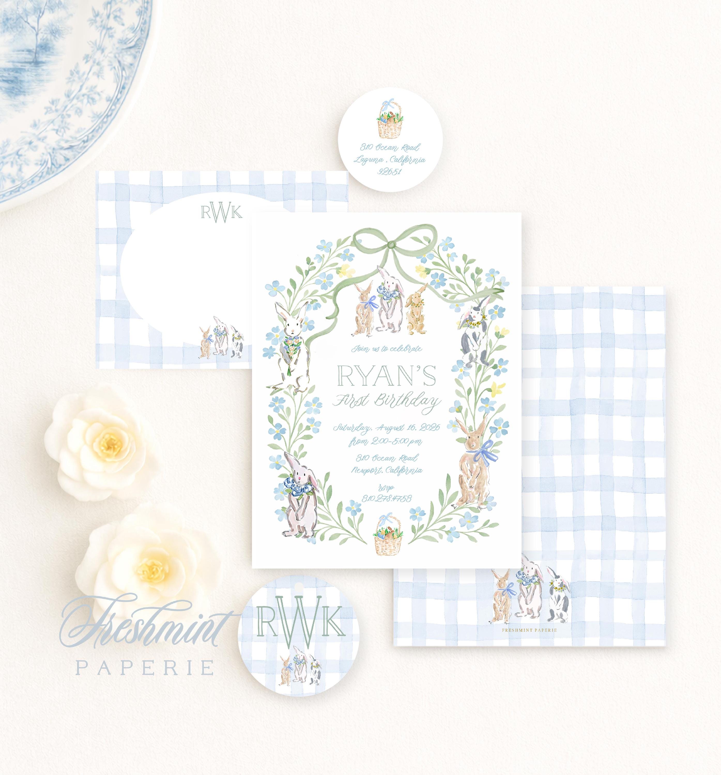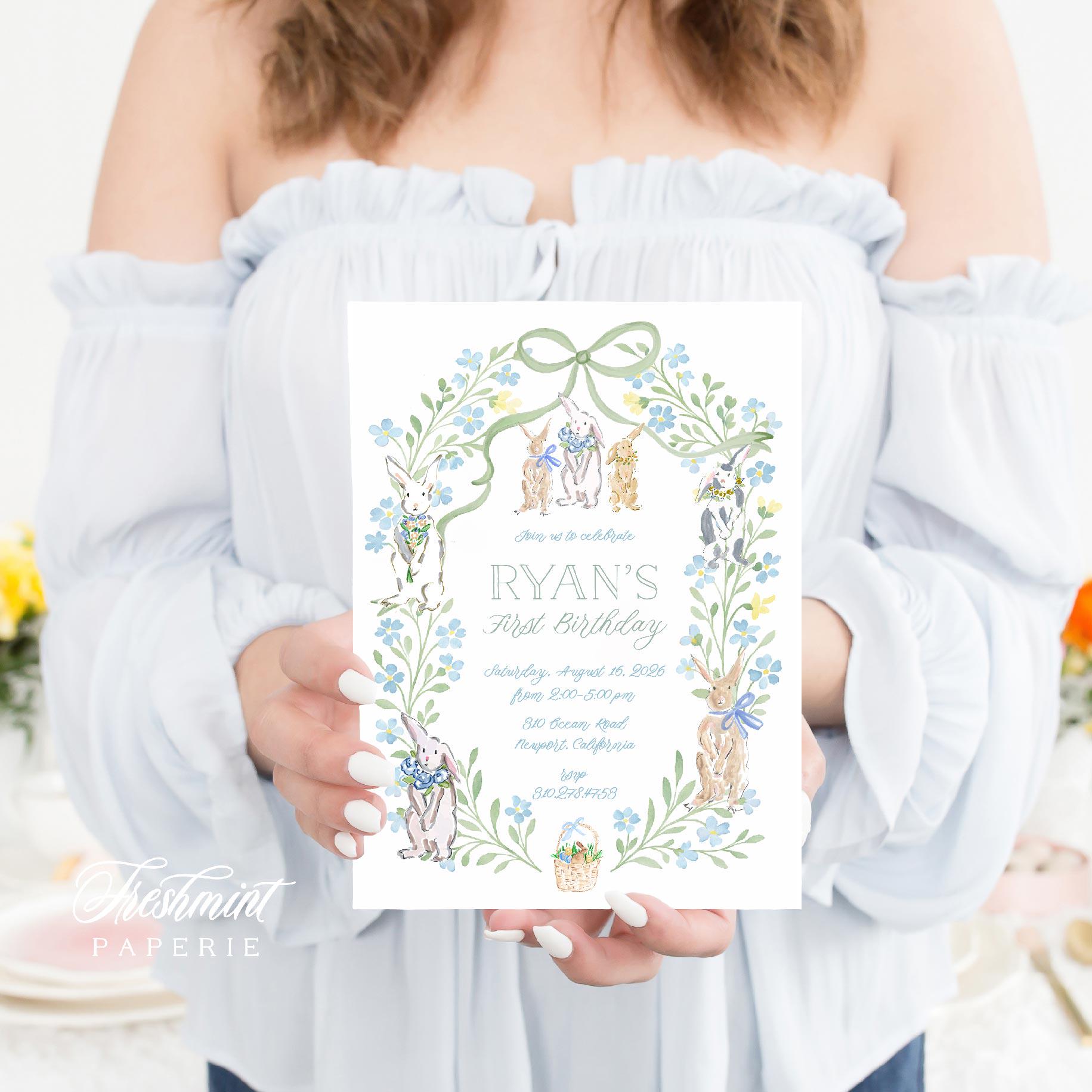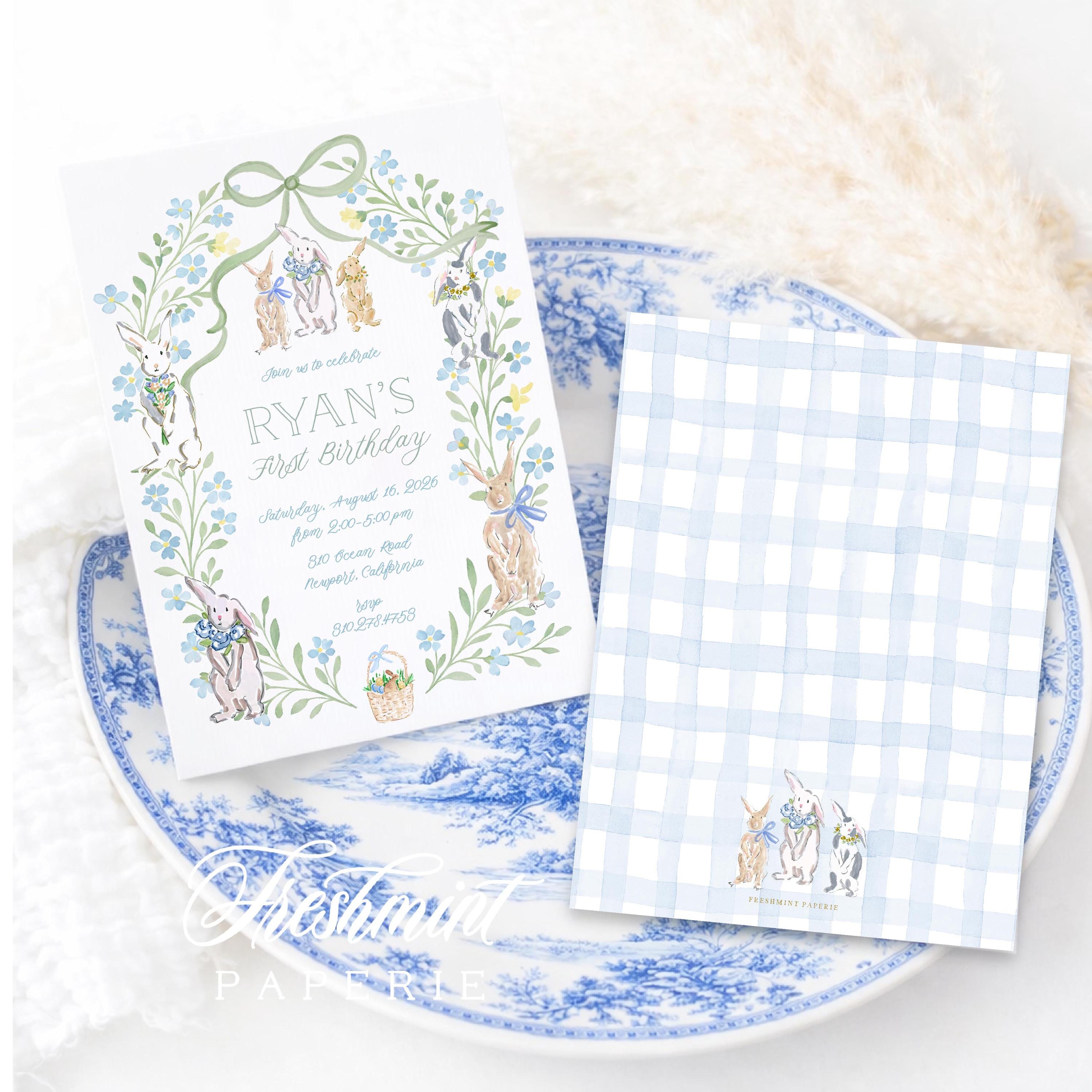 Bunny Birthday Invitation: Blue Bunny, Gingham, Grandmillennial, Blue Bow, Easter