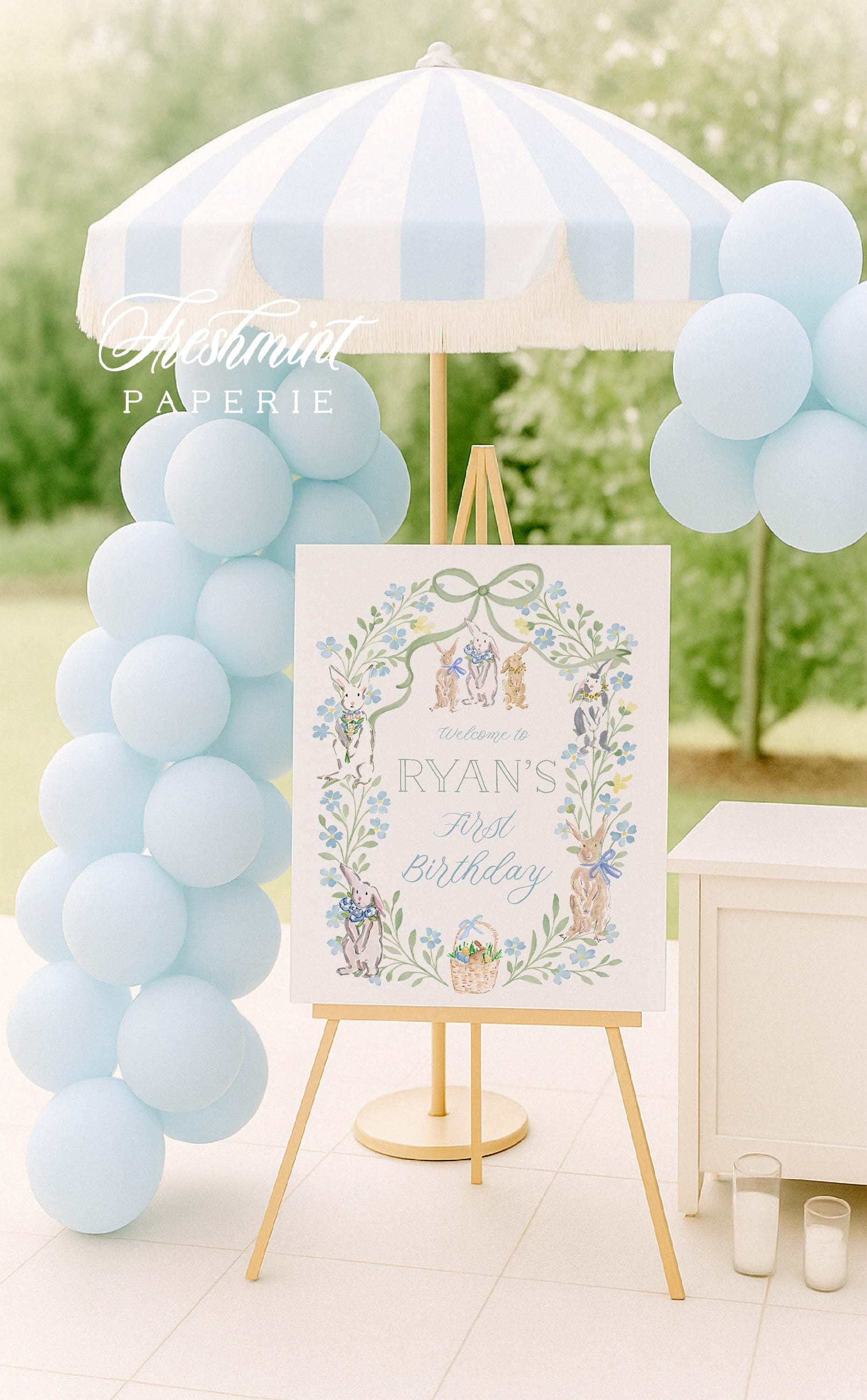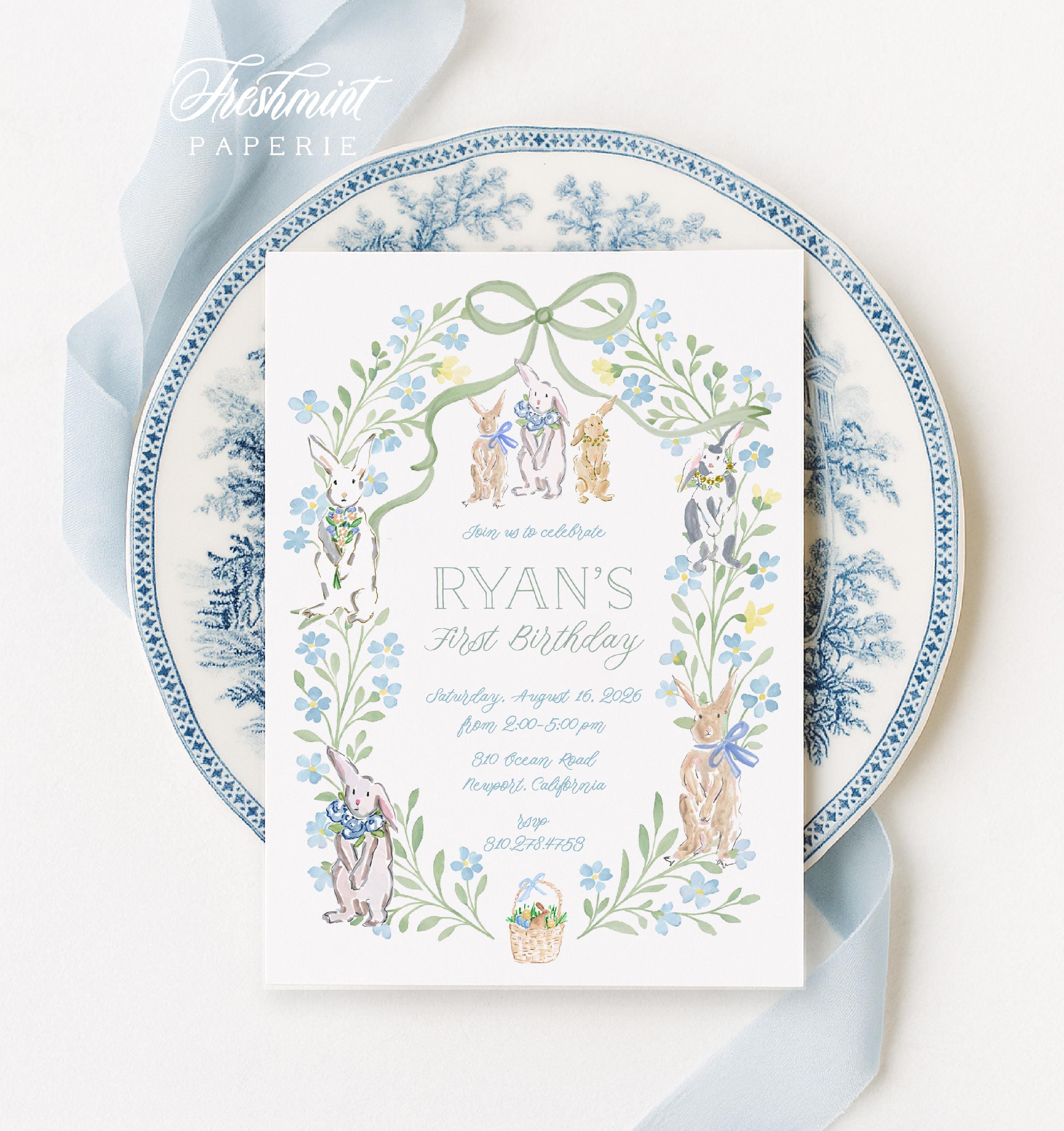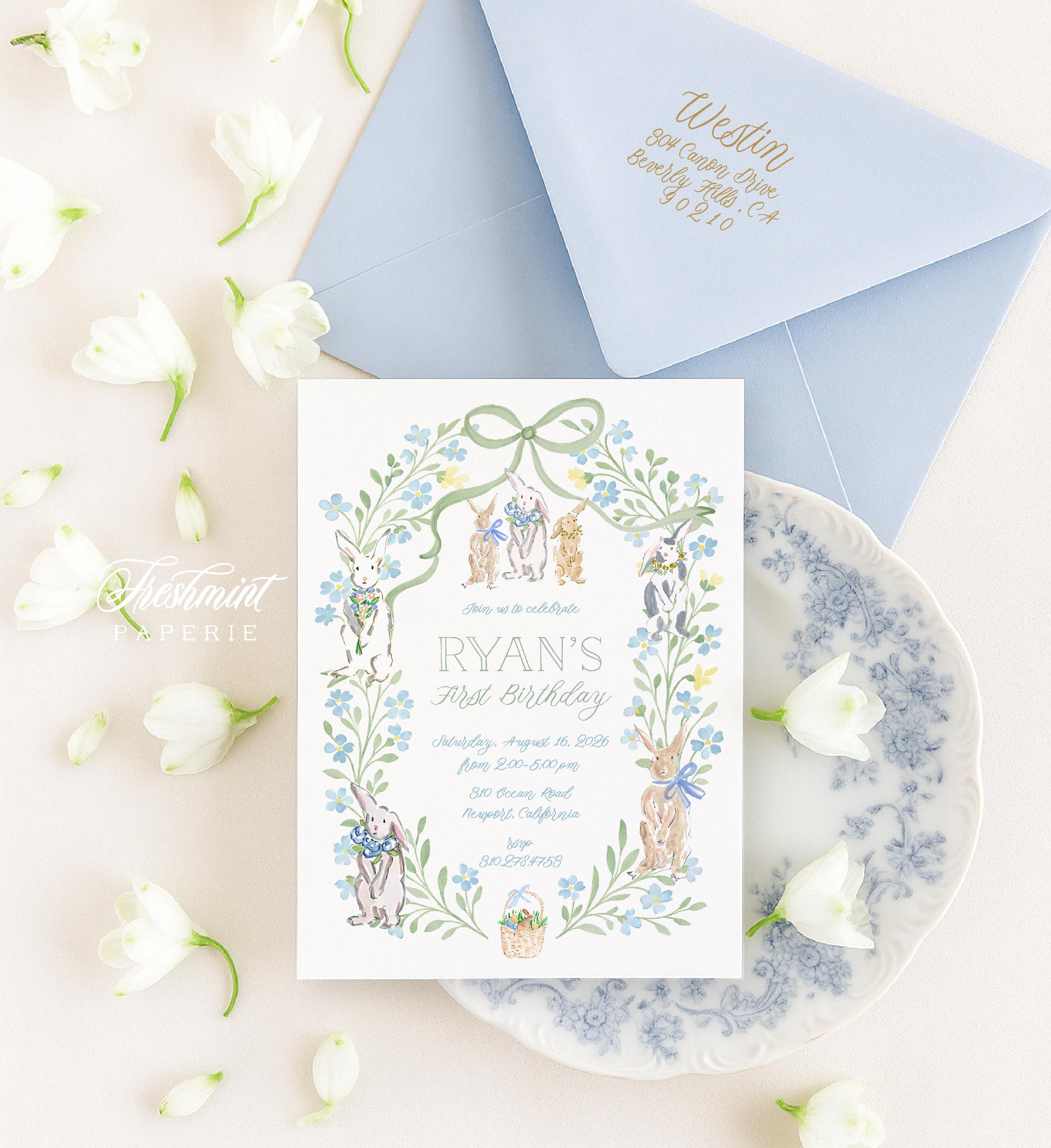 Bunny Birthday Invitation: Blue Bunny, Gingham, Grandmillennial, Blue Bow, Easter