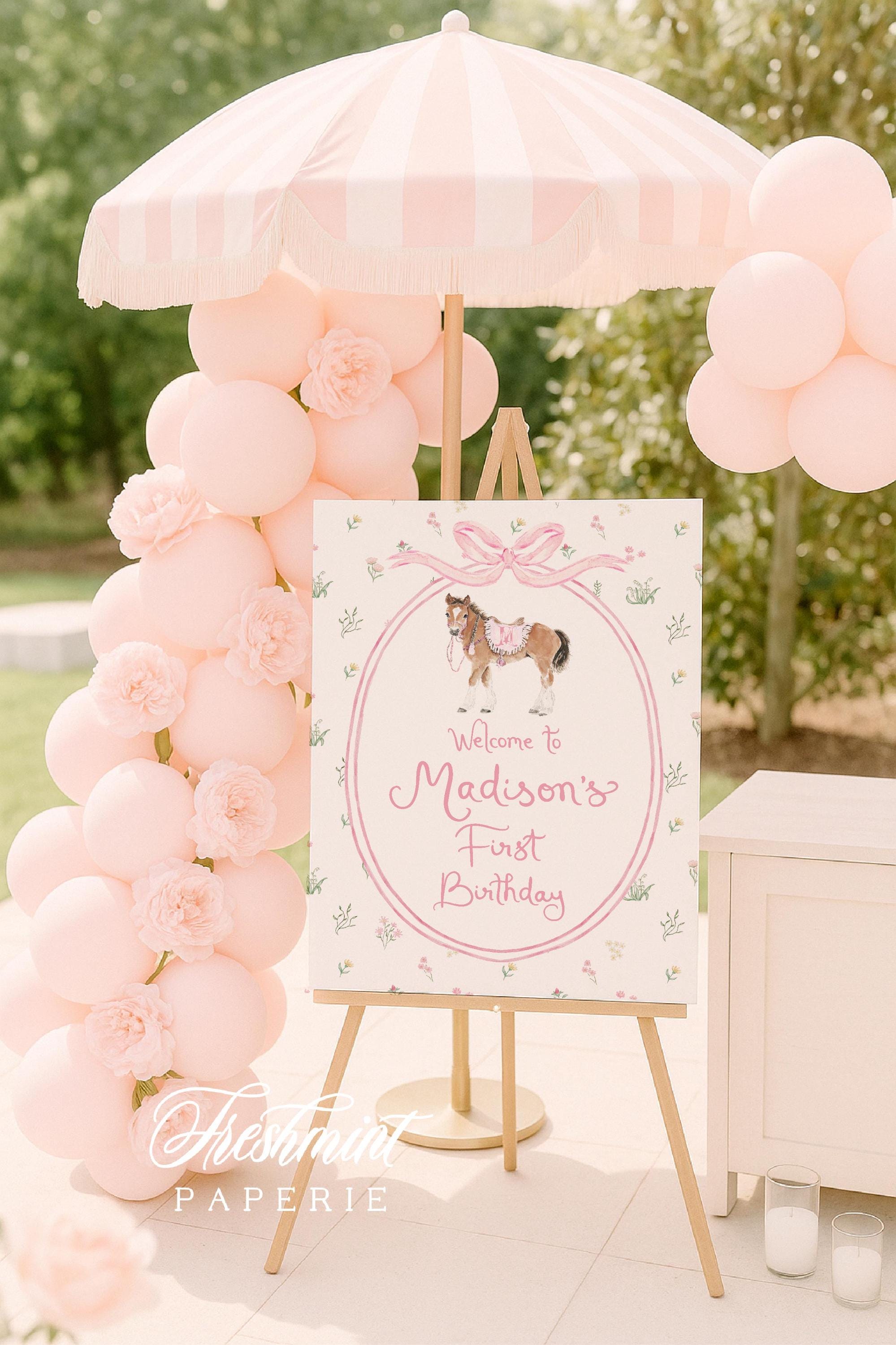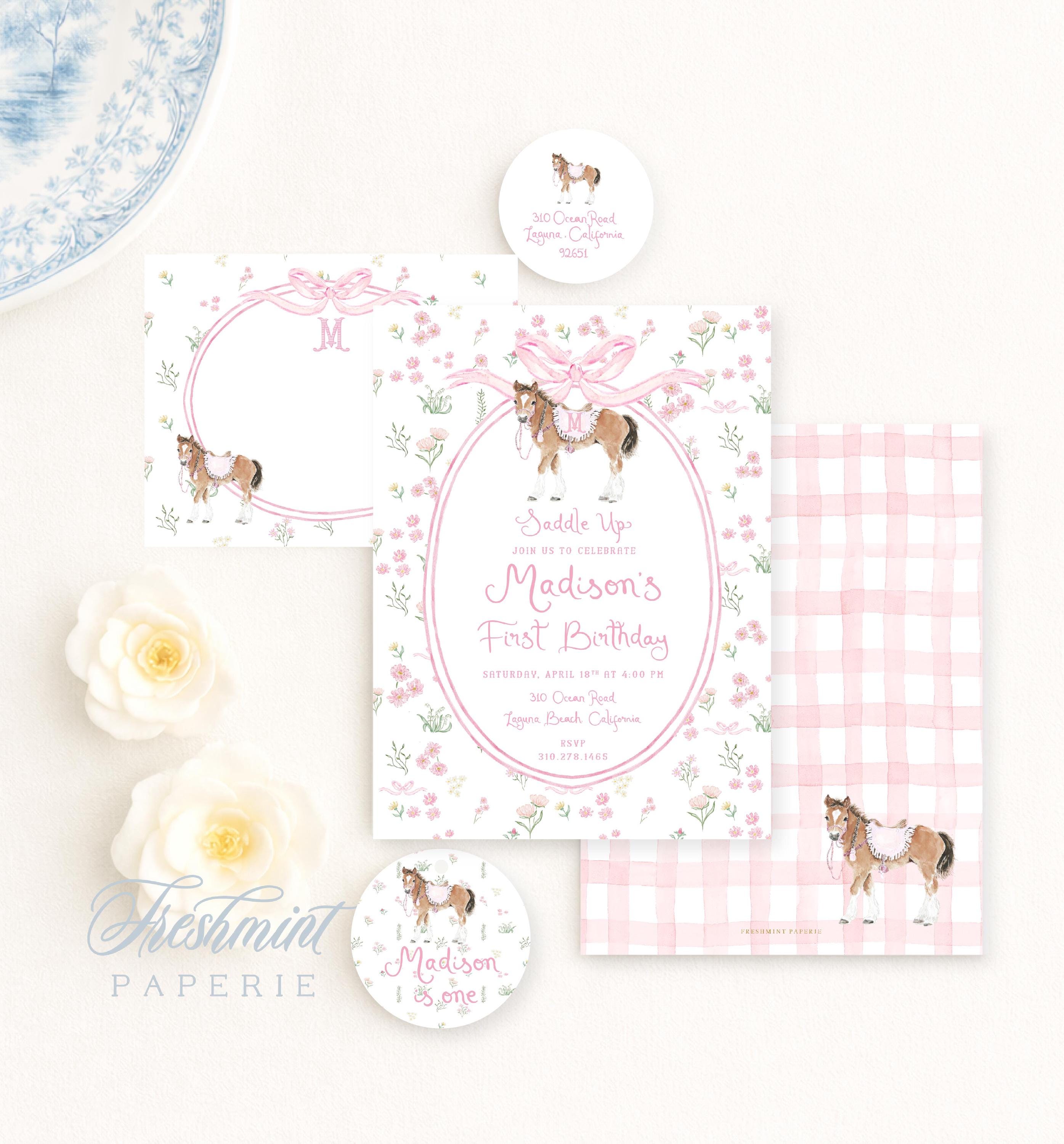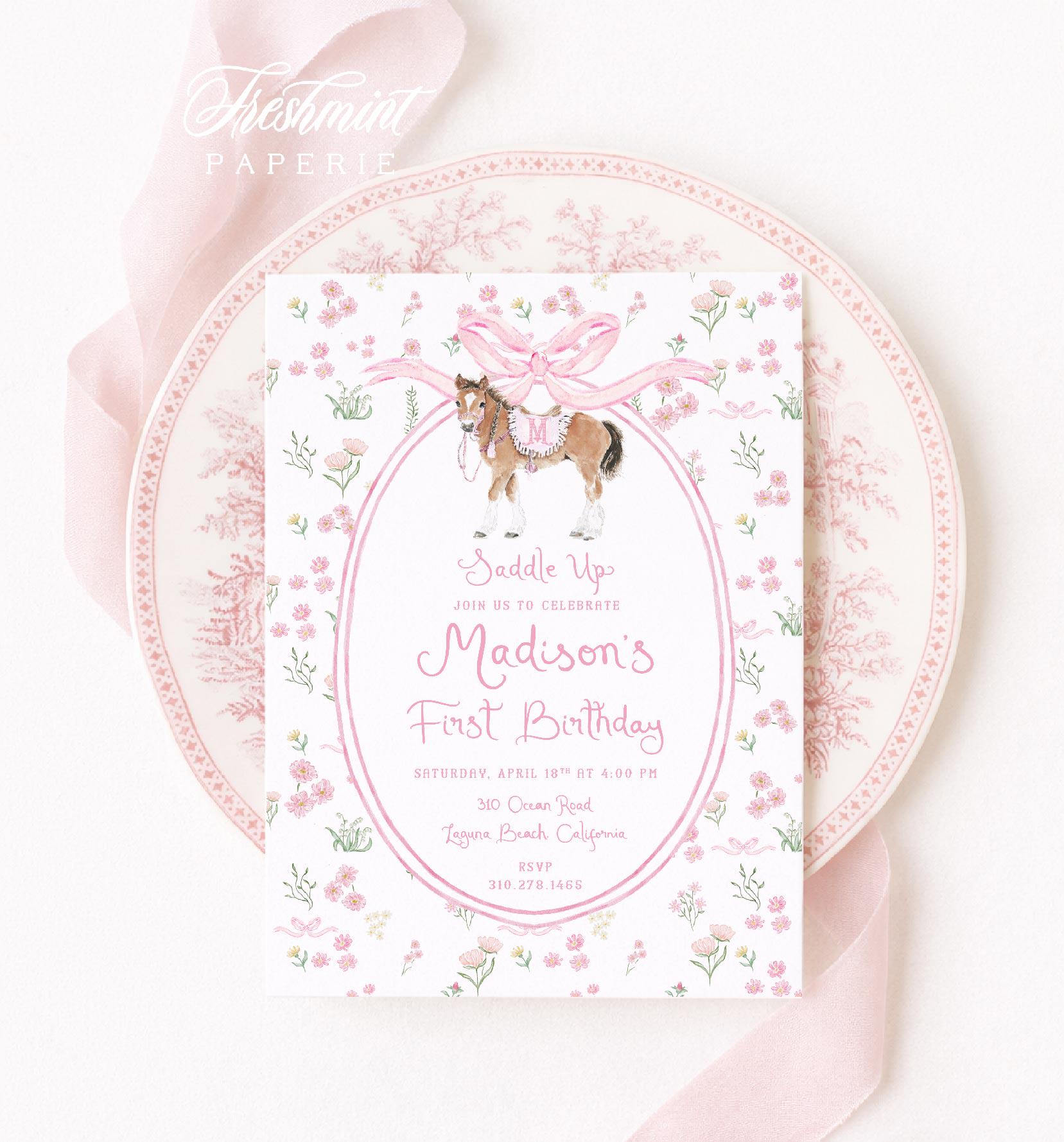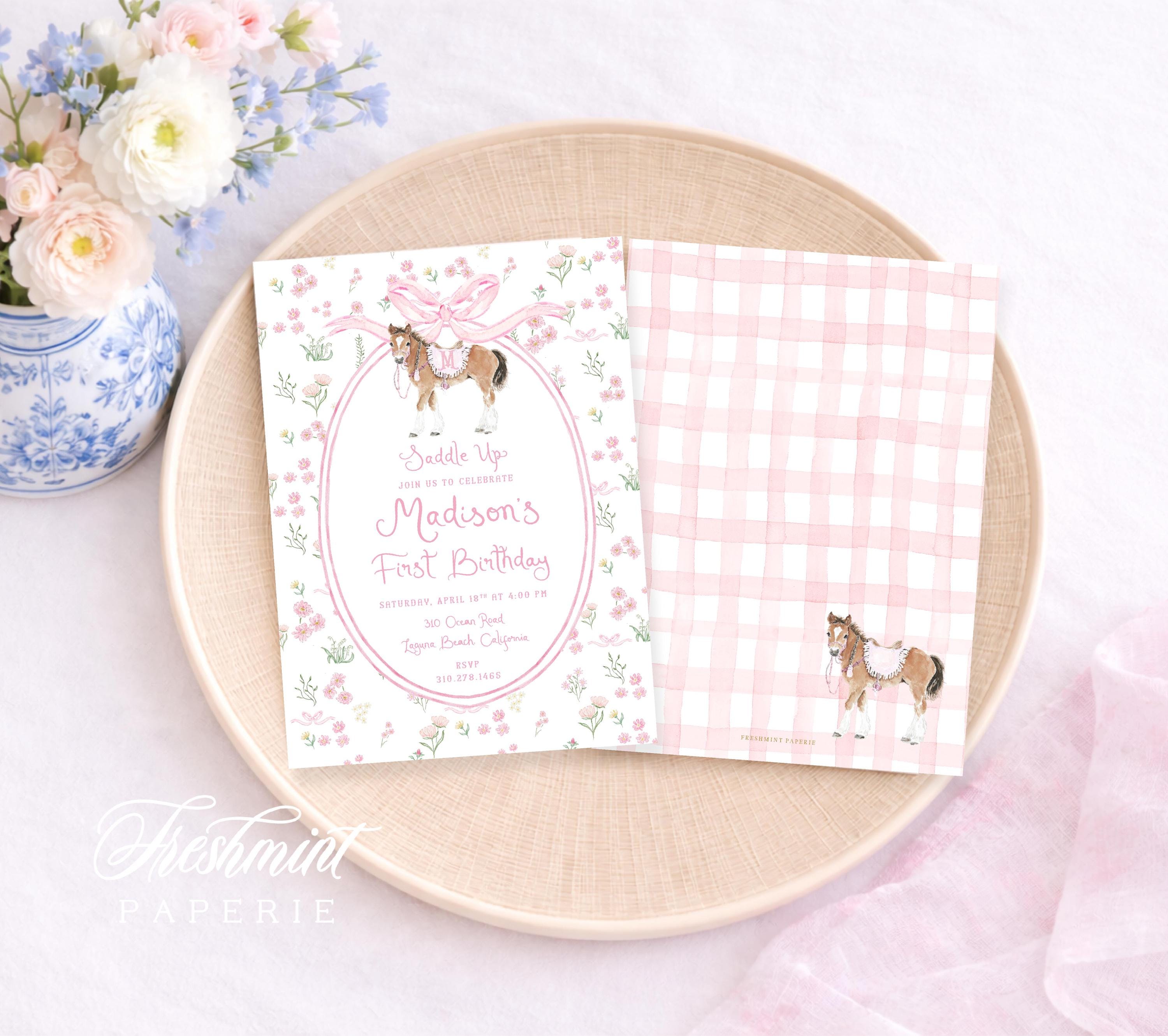 Pony Birthday Invitation, Watercolor Horse Party, Grandmillennial Preppy, Girly, Pink Bow, Floral Border