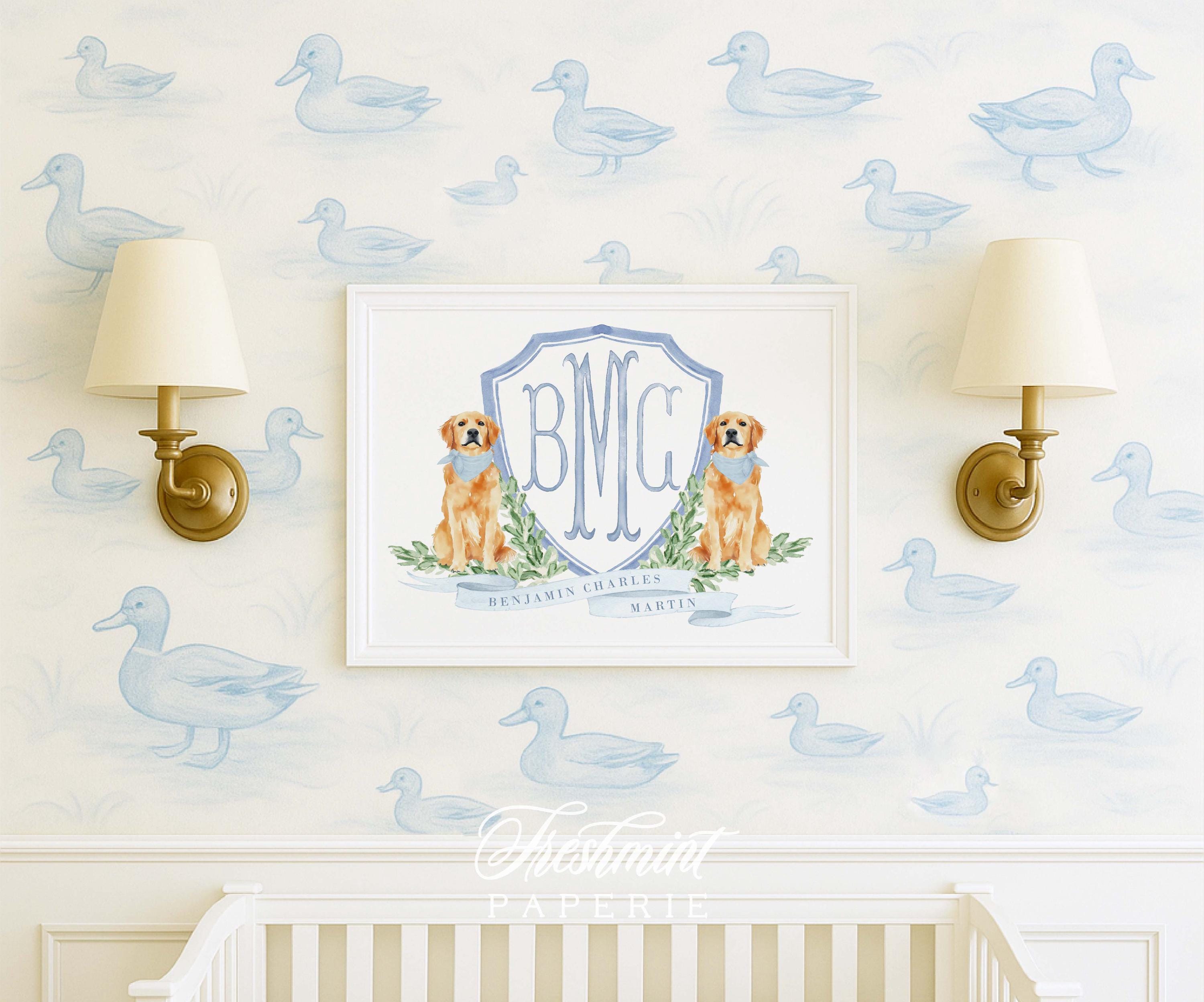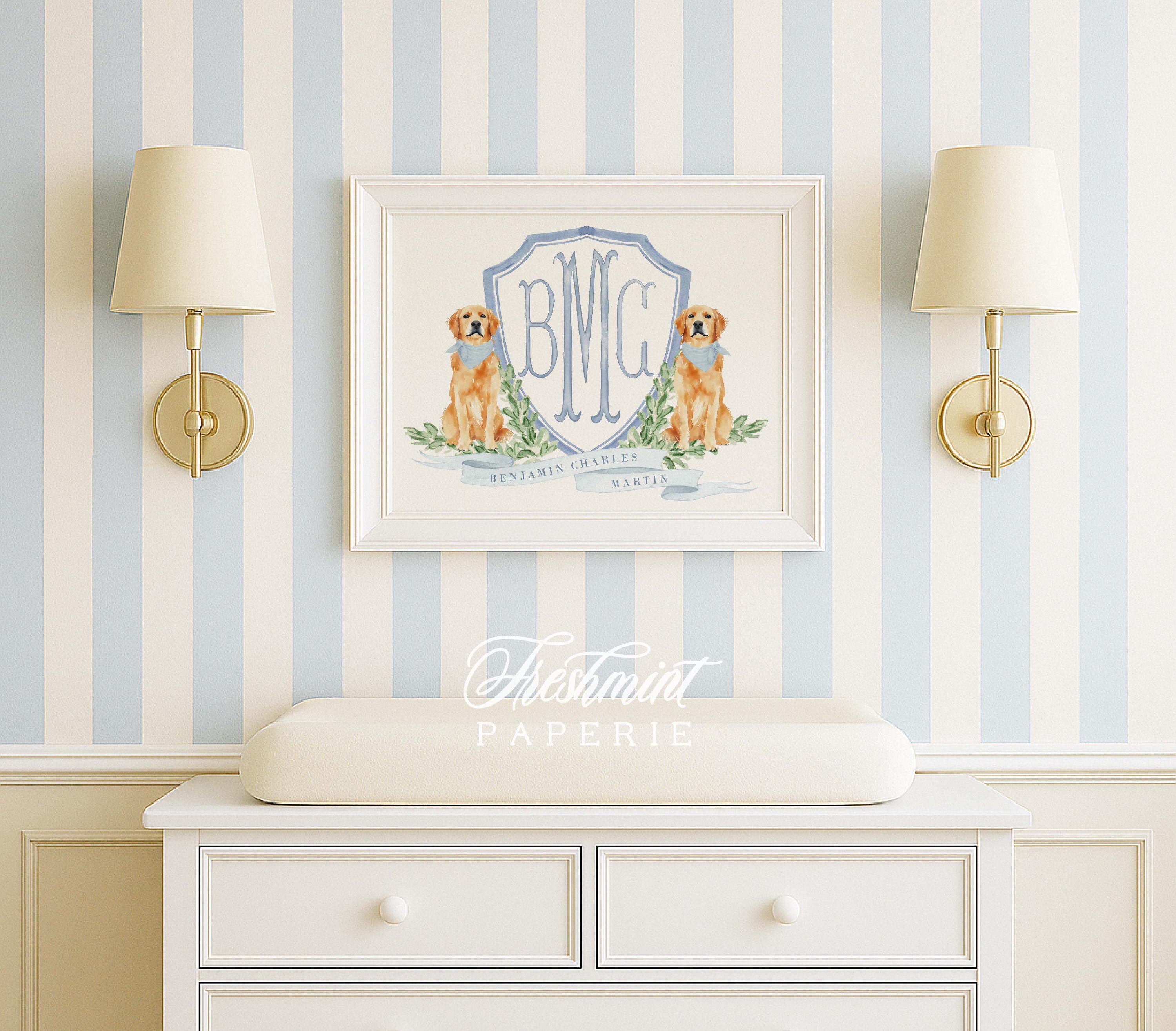 Golden Retriever Nursery Monogram Crest Wall Art Print