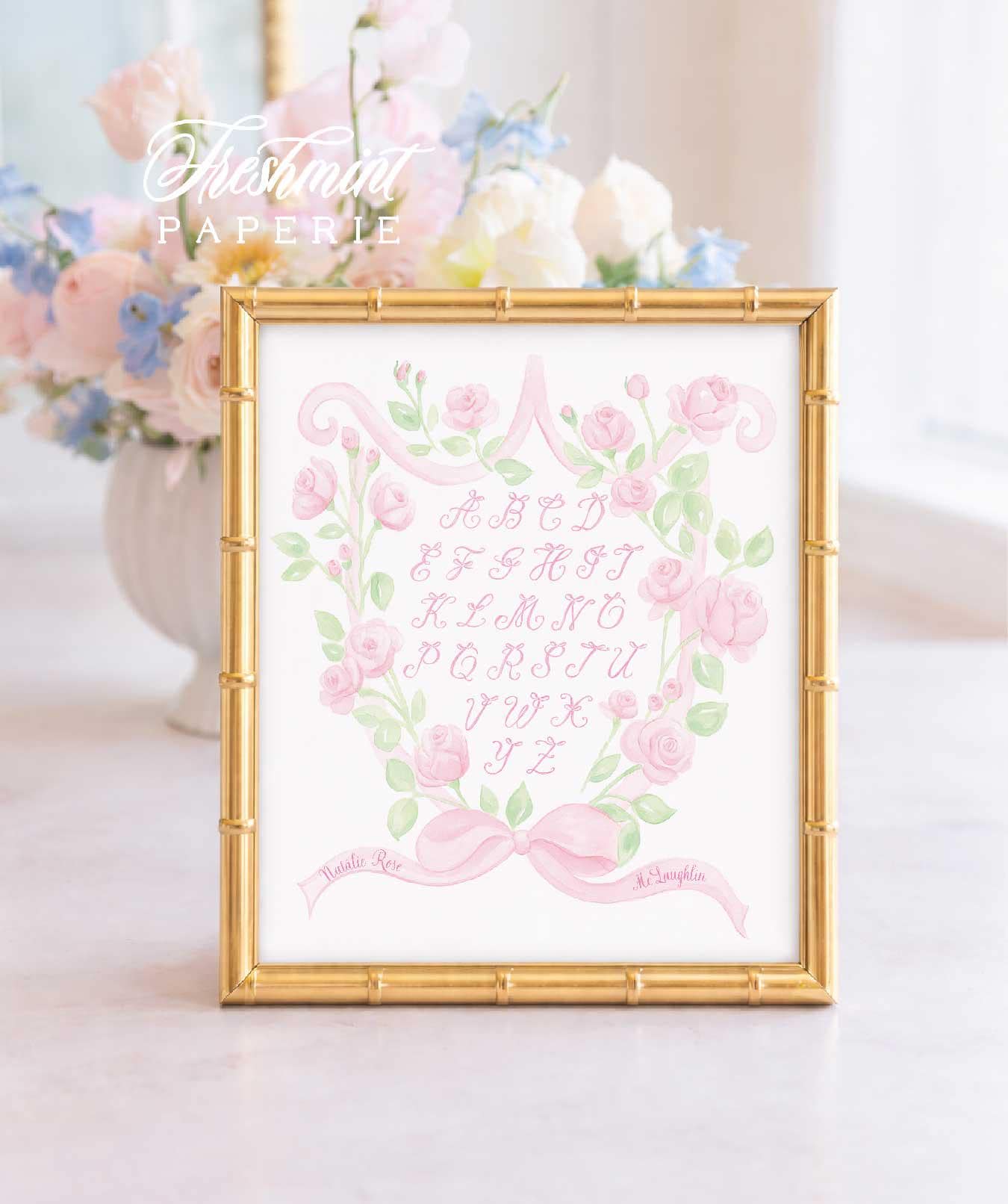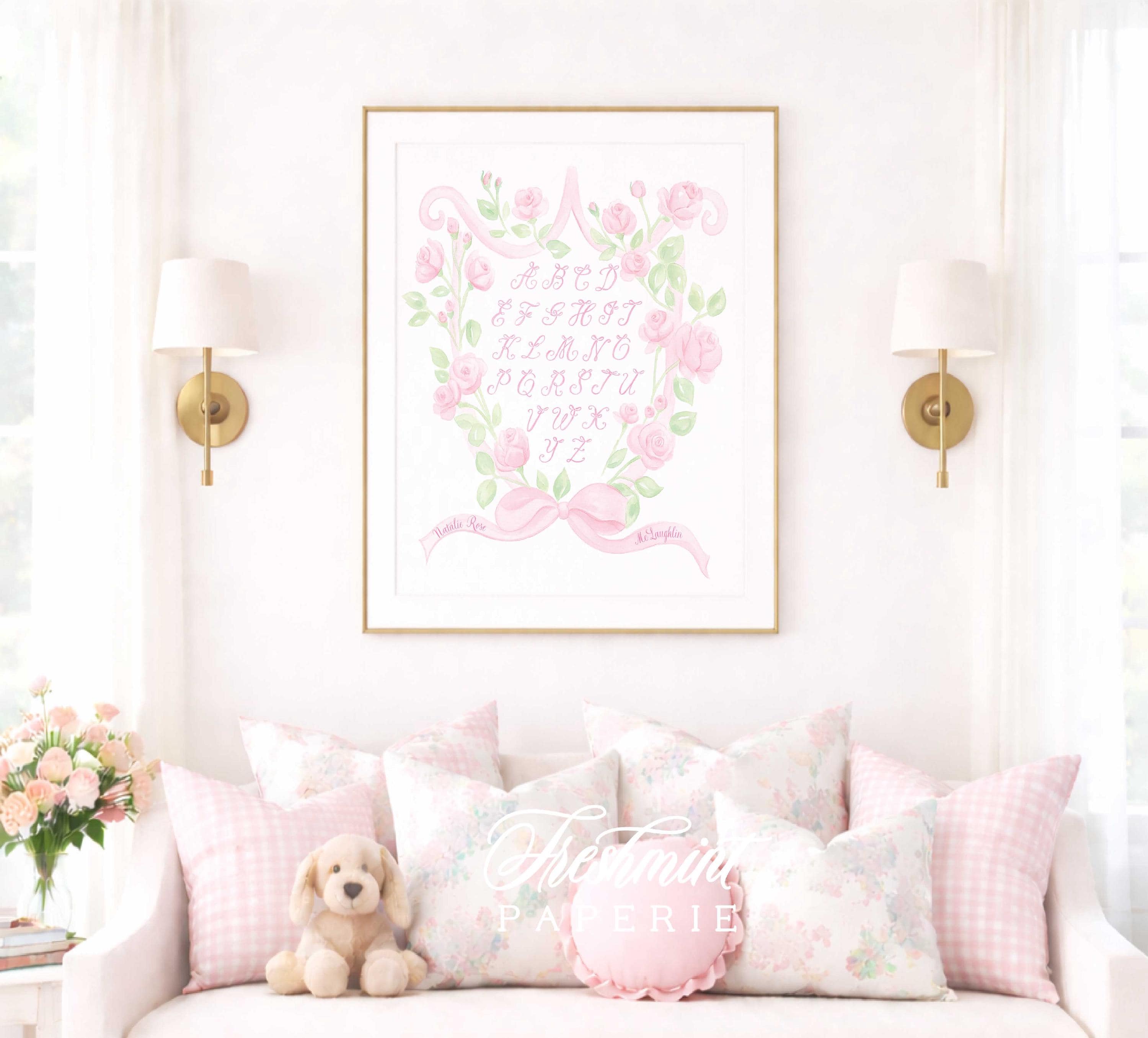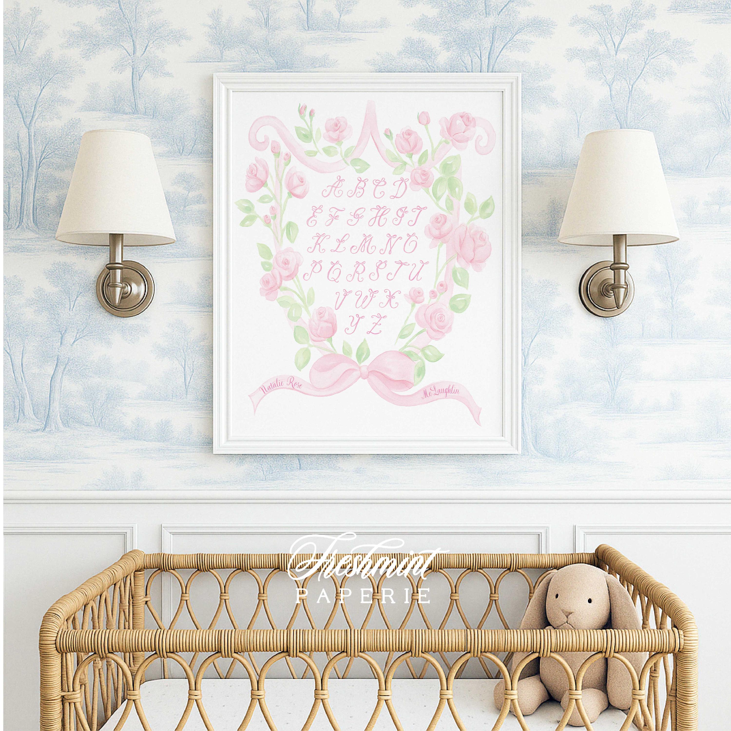 Pink Bow Alphabet Nursery Print, Watercolor, Custom Name Wall Art, Floral Crest