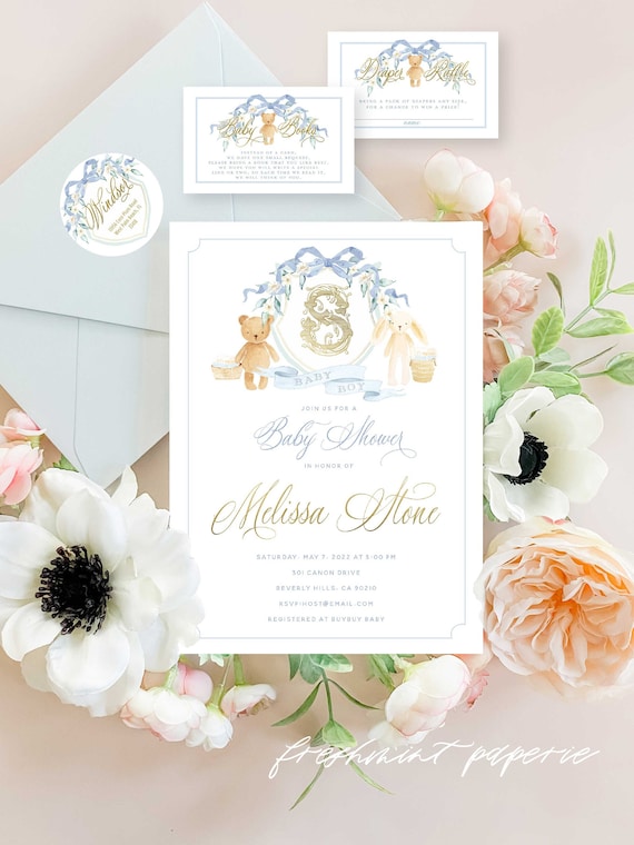 Teddy Bear invitation, Monogram, baby shower, Blue Floral, Gingham, Bow, Grandmillennial, Crest, Watercolor